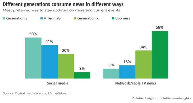 Research regarding social media use, showed that Generation Z uses social media more than TV, as a preferred way to stay updated on news.