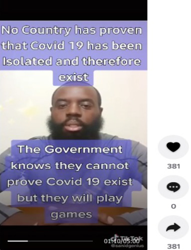 A male adult has posted this video, where he talks about a Nano chip that is being injected into our blood stream through the COVID vaccine. He argues that, this Nano chip injected, has personalized identification numbers for whoever gets the vaccine. Then in cases such as terrorist attacks, the government can swipe through a tablet, which presents our body, and swipe up from the legs to the neck, causing the Nano bites in our blood stream to take over and paralyze us. Upon research this is one of the most extreme conspiracy theories to have been discovered on TikTok. It generates fear amongst any viewer. In this case, it does not only influence younger audience but even older, because sometimes despite logic fear leads to irrational thoughts and decisions. As mentioned earlier, because COVID 19 brought a new way of life and new rules, it threatened and scared many. A study showed that up to 80% of people use social media platforms such as Instagram and TikTok, regarding vaccine updates. [23] This provided the conspiracy theories with an alarmingly big audience. The vaccine is one of the ways to battle the spread and fatality of COVID. Listening to such conspiracy theories rather than trusting that we have to get this vaccine, causes a polarization within society; the vaccinated and the unvaccinated. It has created two realities, as the vaccinated can go out for dinner or enter closed spaces, whereas unvaccinated people cannot. When health authorities, upon research they have conducted, guide us to get the vaccine for various reasons, as citizens we are inclined to do so. We should trust that this is for our benefit because what else can we do as citizens in regard to COVID.
