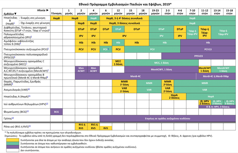 Σε περίπτωση παράλειψης ή καθυστέρησης κάποιας δόσης εμβολίου σε παιδιά και εφήβους, ο ιατρός, σύμφωνα με το ενδεδειγμένο χρονοδιάγραμμα του Εθνικού Προγράμματος Εμβολιασμών Παιδιών και Εφήβων (πίνακας παρακάτω), προσαρμόζει τη συνέχεια των εμβολιασμών.