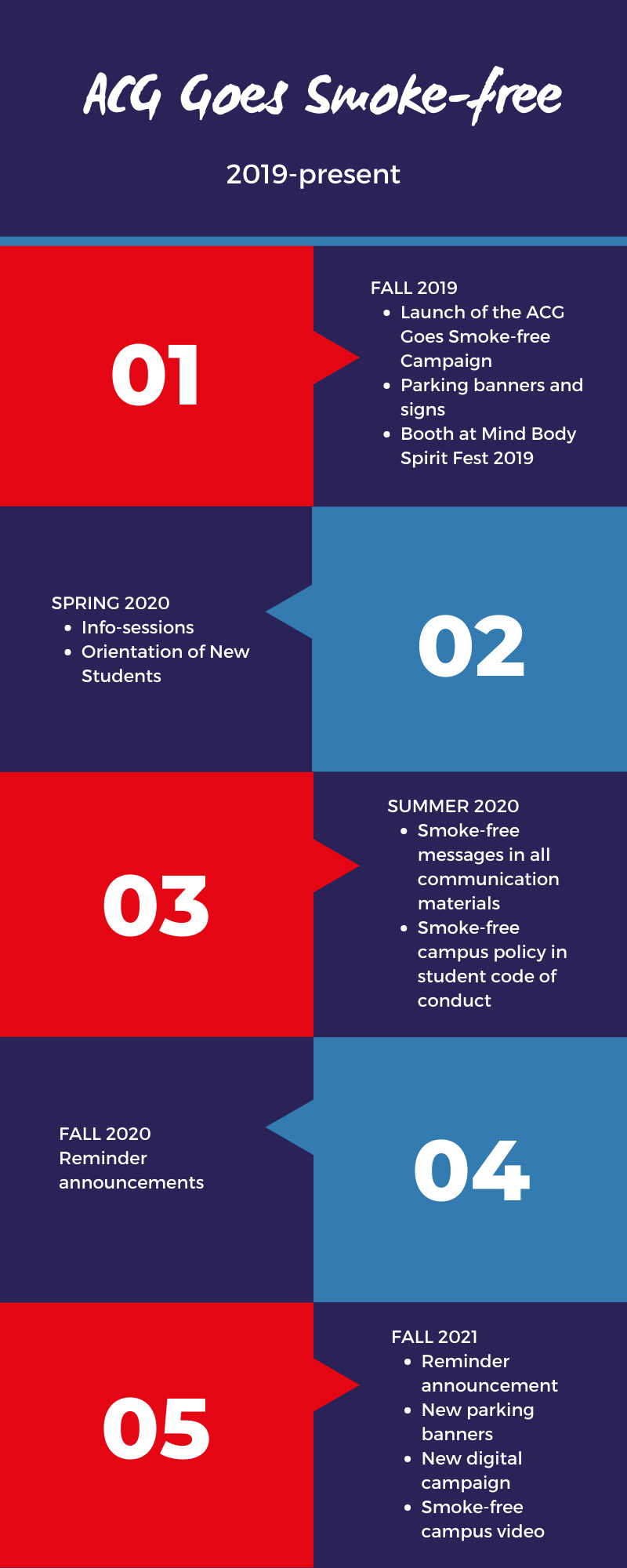 Over the last two years, ACG has launched a smoke-free awareness campaign reiterating its commitment to staying tobacco free and enforcing the national anti-smoking law for educational institutions (Article 3 of the Greek Law No 3730/2008) in effect since 2009. The law declares that all types of smoking, including vaping, are completely prohibited on all campuses and the residences, in both indoor and outdoors areas.