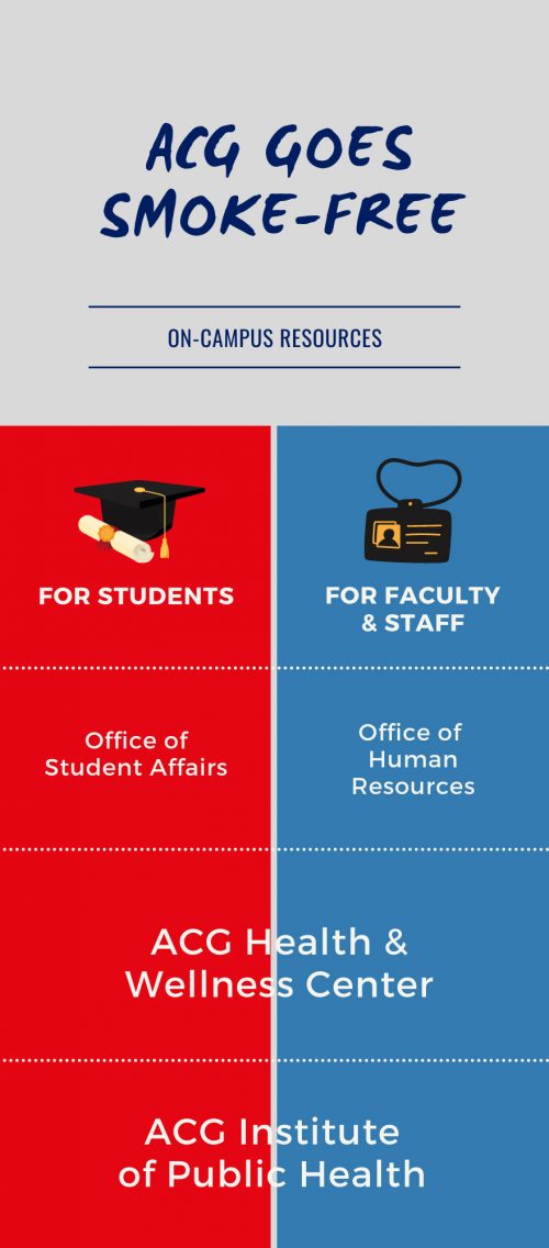 The purpose of the campaign is two-fold: to remind all ACG community—from students, to faculty, to staff and employees, to parents, to alumni and guests across all divisions and campuses —to keep our indoor and outdoor areas smoke-free and to motivate smokers to make a fresh start and choose life instead.