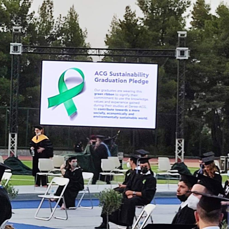Additionally, graduates sign the “ACG Graduation Sustainability Pledge” and wear the ACG Cares green ribbon on their gowns signifying their commitment to advancing sustainability outside campus walls.