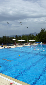 A heated, Olympic size, eight-lane swimming pool affords a breathtaking view of the mountain, soccer field, Aghia Paraskevi, and city of Athens.