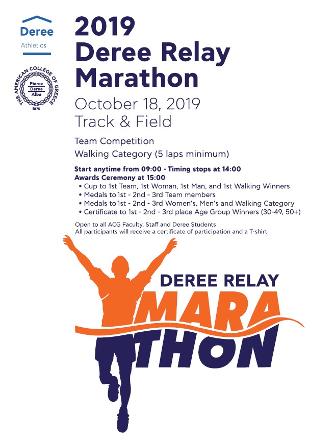The Office of Athletics is happy to announce our annual 19th Deree Relay Marathon, to be held on Friday, October 18 at the Track & Field.