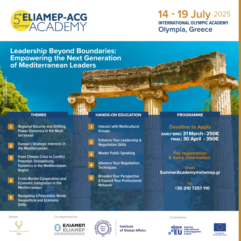 The Hellenic Foundation for European and Foreign Policy (ELIAMEP) and the Institute of Global Affairs at The American College of Greece (ACG) are delighted to announce the 5th ELIAMEP-ACG Summer Academy, which will take place from the 14th – 19th of July 2025 in Ancient Olympia, Peloponnese, Greece. After the success of previous editions, we are now inviting applications from emerging leaders and experts to engage in this transformative educational experience.