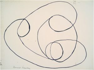 The group show AND ALL OUR WORLD IS DEW brings together artworks from the ACG art collection selected on the basis of a common interest they exhibit in the natural sciences and mathematical theories, as well as in the systematic observation of natural phenomena and new technologies. The metaphysical dimension of geometry, mathematics, quantum physics or astrophysics is rendered through abstract forms, symmetrical and assymetrical systems, diagrams, drawings, gestures as well as through the use of photographic cameras and photocopiers, motors, dimmers, LEDs and other electrical components. As most of them were made between the 1950s and the 1970s, they also bear witness to the transition from geometric abstraction and kinetic art to using computational intelligence as an artistic medium. Gérard Haas’s handmade electronic masks incorporate the contradictions created as a result of this transition, also present in Edward Meeneley’s electrostatic prints and Liliane Lijn’s kinetic model of the universe.