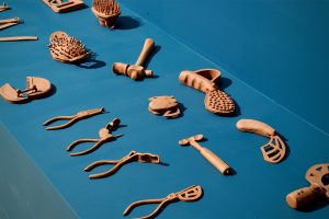 Οn display are also new commissions as well as other artworks brought in specifically for the exhibition, two of which are actively engaged in conversation with the ACG Collection, as co-curatorial proposals. Natalia Manta retrieves from the collection the old ‘technology’ of the tools used by artists Michael Lekakis and Frances Rich, in order to process their archetypal power through a display-work reminiscent of a pseudo-self-powered oscilloscope system. HYPERCOMF, for their part, make a targeted selection of Haas’s shamanic masks. Τhese masks are placed in conversation with the faceless machines of HYPERCOMF’s embroidery produced on a jacquard loom, which formed the basis for the first programmable machines, and, by extension, today’s computer.