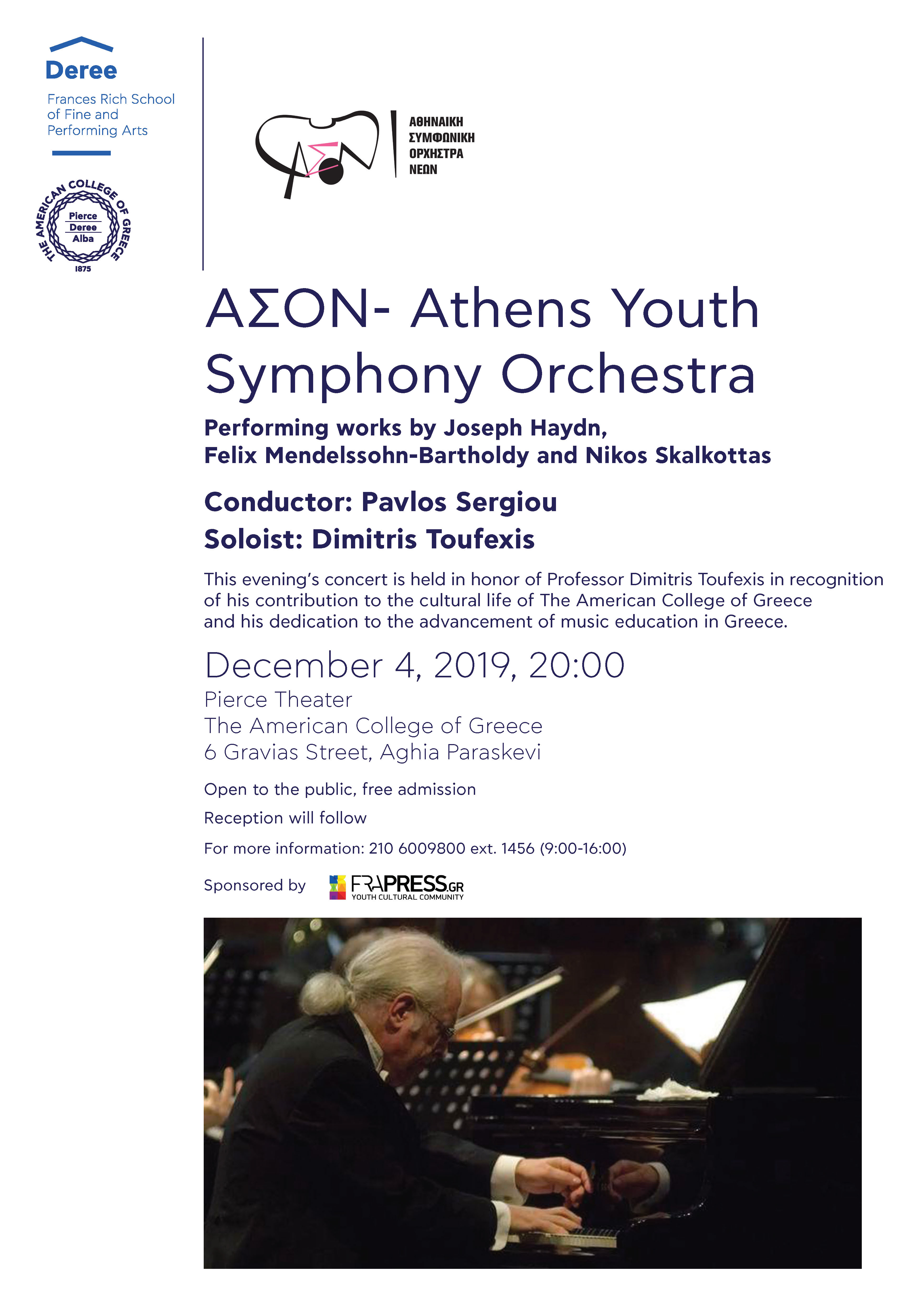 When: December 4, 2019, 20:00 Where: Pierce Theater ΑΣΟΝ- Athens Youth Symphony Orchestra Performing works by Joseph Haydn, Felix Mendelssohn-Bartholdy and Nikos Skalkottas Conductor: Pavlos Sergiou Soloist: Dimitris Toufexis This evening’s concert is