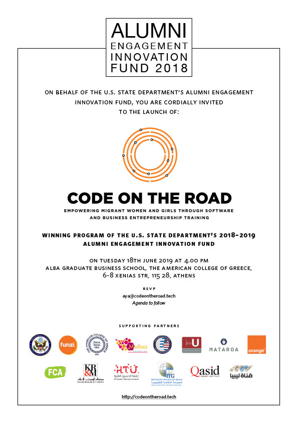 “Code On The Road’, a winning program of the U.S. State Department’s Alumni Engagements Innovation Fund for empowering migrant women and girls through software and business entrepreneurship training, is launching on July 18, 2019 at Alba Graduate Business School, The American College of Greece.