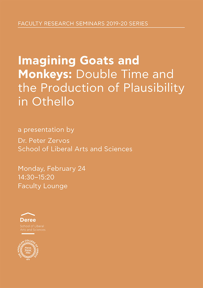 When: Monday, February 24 | 14:30–15:20 Where: Faculty Lounge Imagining Goats and Monkeys: Double Time and the Production of Plausibility in Othello a presentation by Dr. Peter Zervos School of
