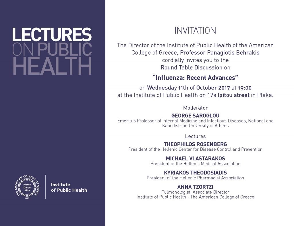 Round Table Discussion When: Wednesday, October 11, 19:00-20:35 Where: 17b Ipitou Street, Plaka, Athens Organized by: Institute of Public Health 19:00 – 19:15 INTRODUCTION Moderator: George Saroglou Emeritus Professor of Internal Medicine and Infectious Diseases, National and Kapodistrian University of Athens LECTURES 19:15 – 19:30 Ιnfluenza: