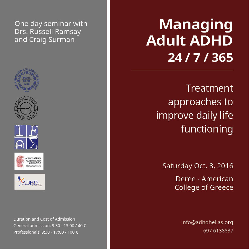 The seminar is organized by the Pan-Hellenic Association of Individuals with Attention Deficit Disorder, ADHD HELLAS in collaboration with Dr. Artemios Pehlivanidis, under the auspices of the 1st Psychiatric Clinic of the Athens Medical School at Eginition Hospital, the Hellenic Society of Cognitive Psychotherapies, and the Institute of Behavioral Research and Therapy.