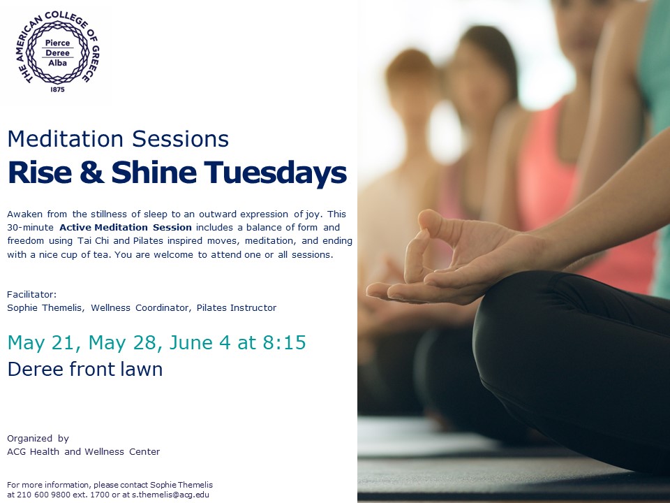 When: May 21, May 28, June 4 at 8:15 Where: Deree front lawn Awaken from the stillness of sleep to an outward expression of joy. This 30-minute Active Meditation Session includes a balance