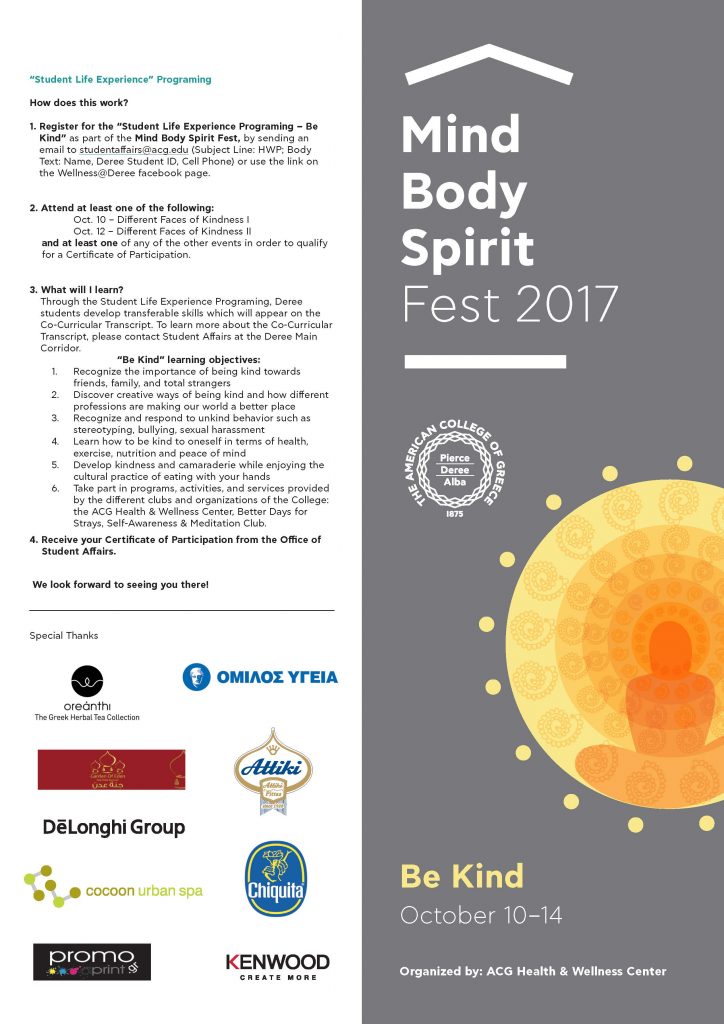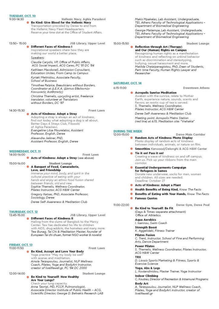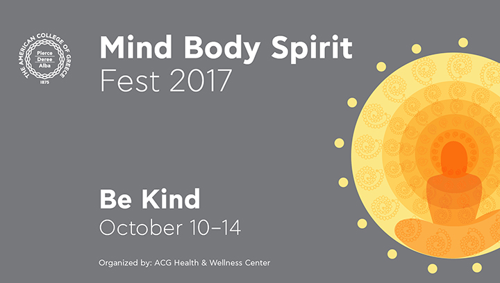 When: Tuesday, October 10 - Saturday, October 14 Where: Deree - The American College of Greece, Athens and Acropolis area/ Vrahakia Organized by: The ACG Health & Wellness Center This year’s theme is “Be Kind”.