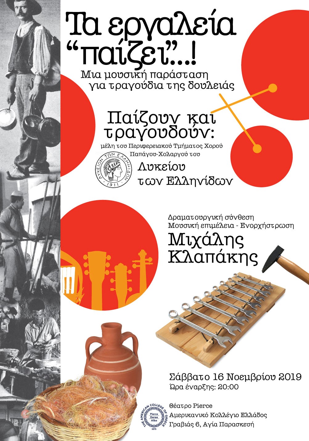 When: November 16, Saturday, 2019, 20:00 Where: Pierce Theater – The American College of Greece Music on Work Theme A musical/dance performance about work theme songs Organized by Λύκειον Ελληνίδων, Papagou – Cholargos Chapter By