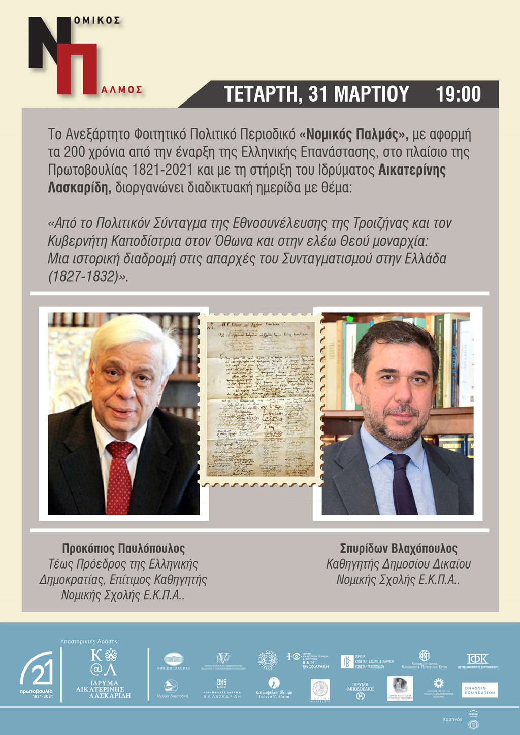 YΠΟ ΤΗΝ ΑΙΓΙΔΑ ΤΗΣ ΠΡΩΤΟΒΟΥΛΙΑΣ 1821-2021 When: Wednesday, March 31, 2021 | 19:00 Οργάνωση: ΦΟΙΤΗΤΙΚΟ ΠΕΡΙΟΔΙΚΟ «ΝΟΜΙΚΟΣ ΠΑΛΜΟΣ» - ΕΚΠΑ Hosted by: Deree - The American College of Greece Online event free and