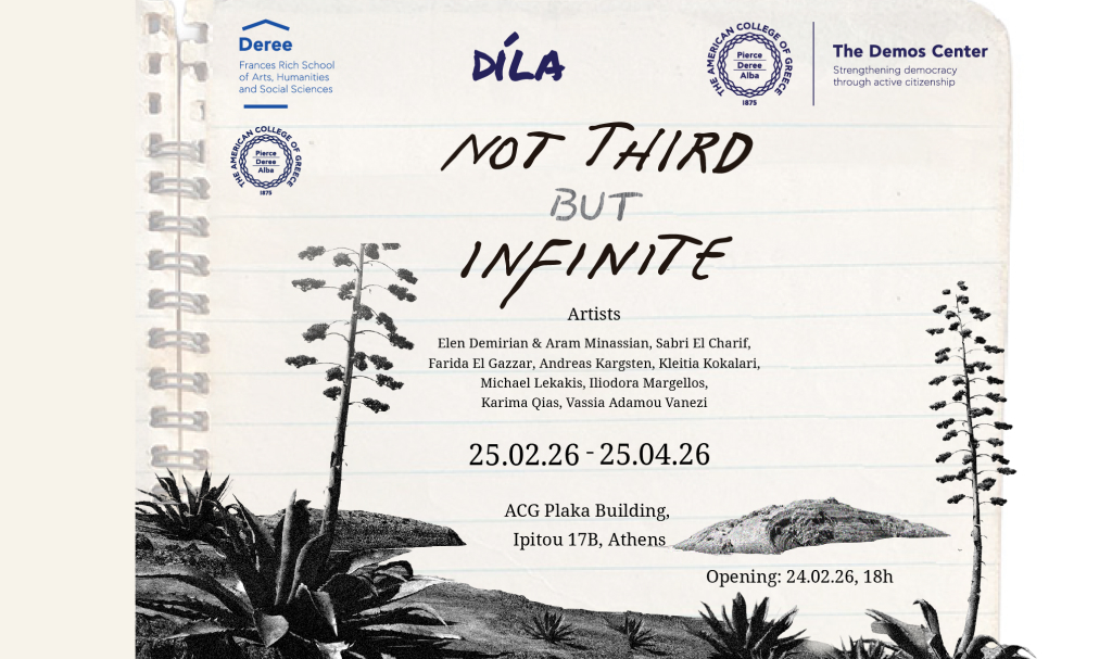 Not Third but Infinite is co-organized by Díla, The Frances Rich School of Arts, Humanities and Social Sciences, The Demos Center of The American College of Greece. As a collaborative endeavor, the exhibition reflects the School’s commitment to offer a wide range of artistic activities and promote its students and graduates, The Demos Center’s mission to foster a sense of active citizenship—particularly among younger generations—as well as Díla’s dedication to supporting young refugee women on creative career paths.