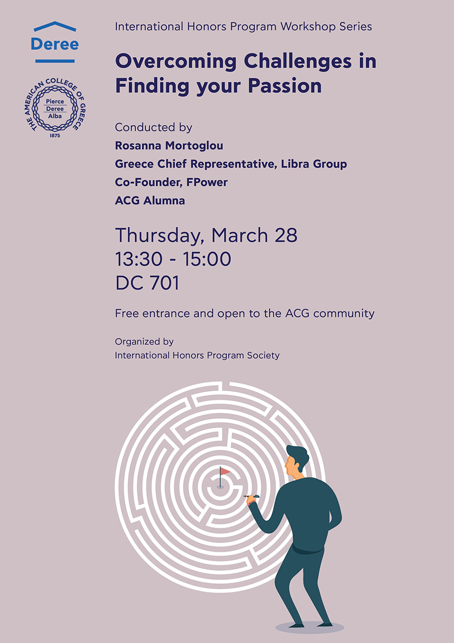 When: Thursday, March 28, 13:30 – 15:00 Where: DC 701 International Honors Program Lecture Series Overcoming Challenges in Finding your Passion Conducted by Rosanna Mortoglou Greece Chief Representative, Libra Group Co-Founder, FPower ACG Alumna Free entrance and open to