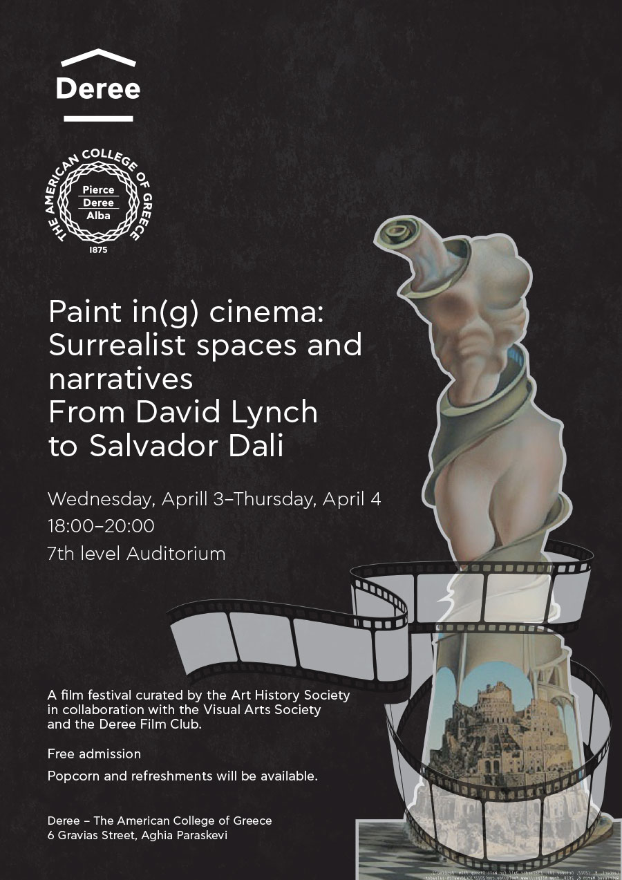 The curatorial selection of the festival focuses on short to mid-length experimental motion pictures. From David Lynch to Salvador Dalí, this festival will navigate the audience through the world of diverse surrealist approaches in cinema. Screenings will be followed by a post-reflective discussion led by Dr. Sotirios Bahtsetzis, Curator and Art History Professor at Deree.