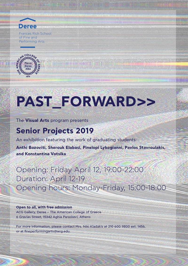 When: April 12-19 Where: ACG Gallery The Visual Arts program presents Senior Projects 2019 An exhibition featuring the work of graduating students: Anthi Bozoviti, Sherouk Elabasi, Pinelopi Lykogianni, Pavlos Stavroulakis, and Konstantina Votsika