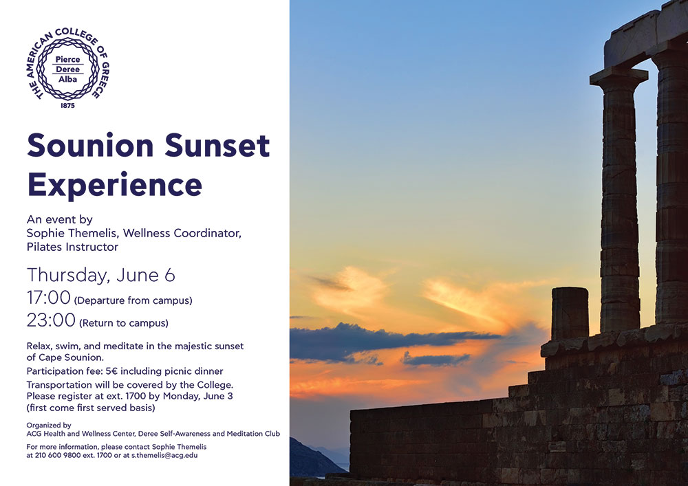 When: Thursday, June 6 Where: Cape Sounion An event by Sophie Themelis, Wellness Coordinator, Pilates Instructor Thursday, June 6 17:00 (Departure from campus) 23:00 (Return to campus) Relax, swim, and meditate in the majestic sunset of
