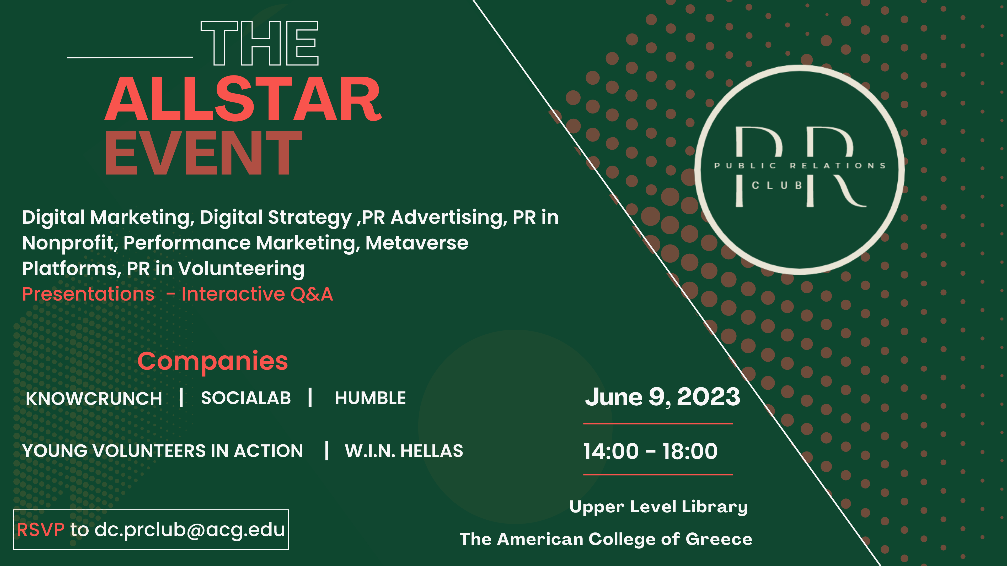 When:June 9, 14:00-18:00 Where: ACG Events Hall Organized by: Public Relations Club About the event The All-Star Event is a great opportunity for students to get familiar with topics revolving around Public Relations. A