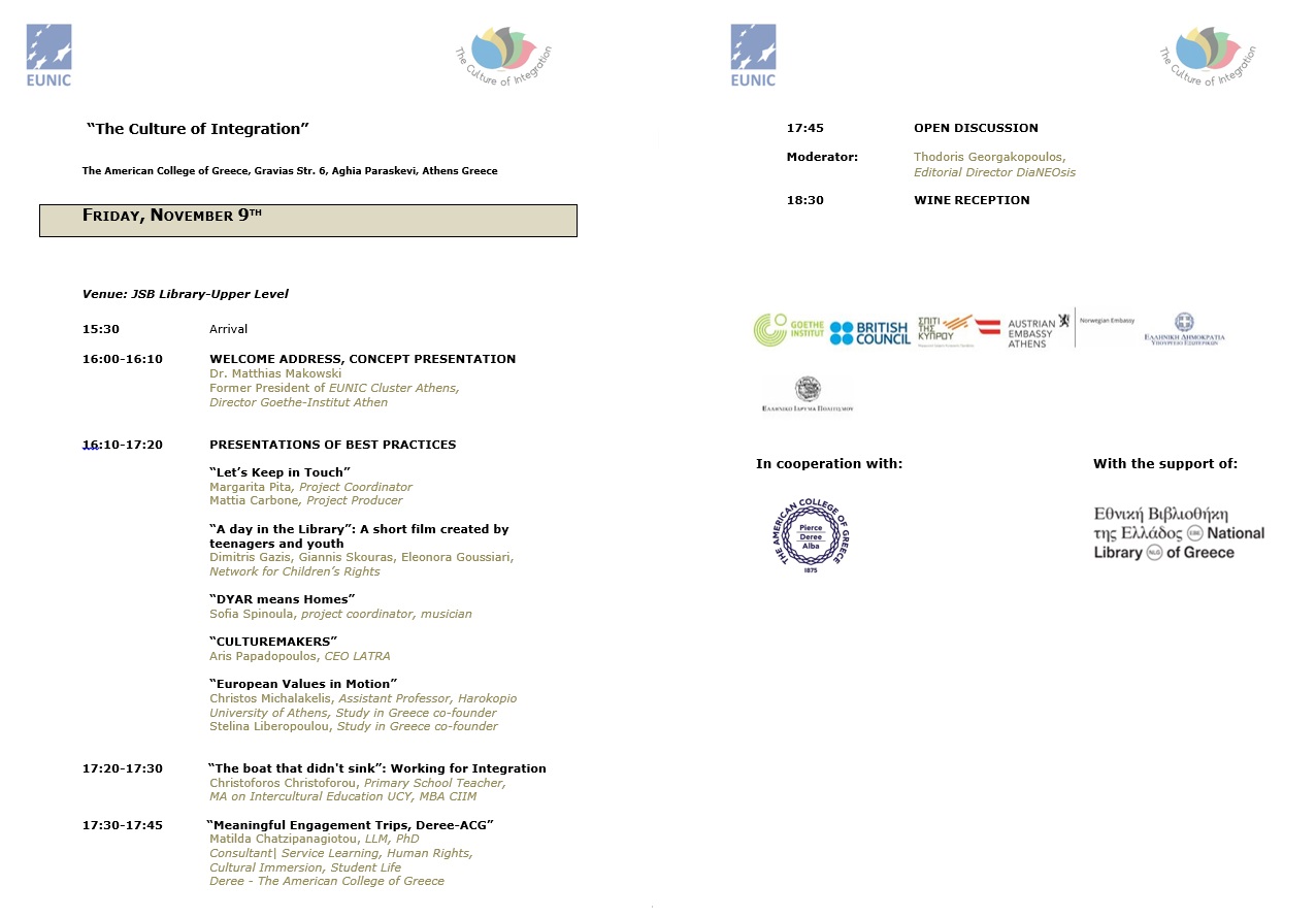 EUNIC Cluster Athens is inviting you at the final event of the project “The Culture of Integration” which will take place on Friday, 9 November 2018, from 15:30 pm to 19:30 pm at The American College of Greece, 6 Gravias Str., Ag. Paraskevi.