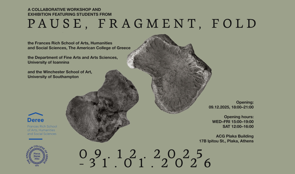 Pause, Fragment, Fold presents the outcome of a collaborative process between students from the Frances Rich School of Arts, Humanities and Social Sciences at The American College of Greece, the Department of Fine Arts and Arts Sciences at the University of Ioannina, and the Winchester School of Art at the University of Southampton. Through a series of workshops, the students examined authorship, collective work, and dialogic artistic practice while also engaging with the ACG Art Collection. The exhibition foregrounds the fragment as a conceptual locus for rethinking form, narrative, and the conditions under which meaning emerges.