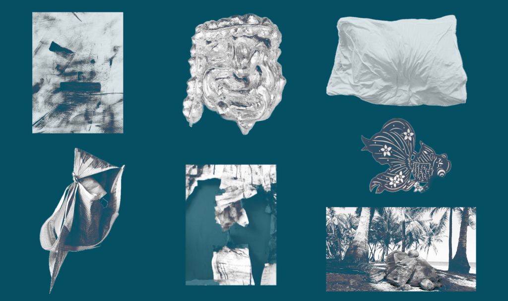 Kitchen towel, thread, fabric, pen, graphite, charcoal, cardboard, acrylics, oil paints, bin bags