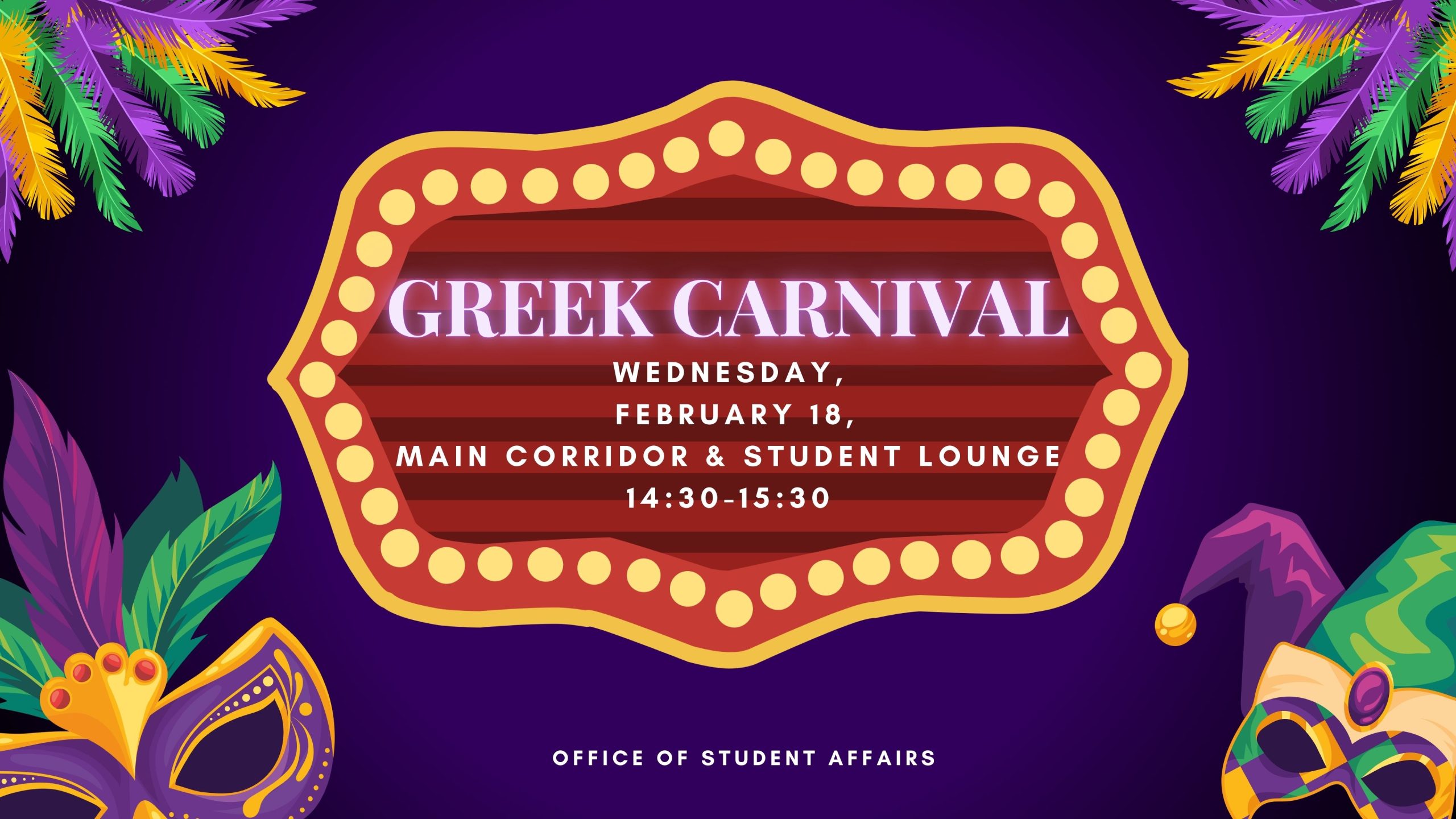 When: Wednesday, February 18, 14:30 – 15:30 Where:Main Corridor and Student Lounge Organized by: Office of Student Affairs About the event Celebrate Carnival with a day full of color, excitement,