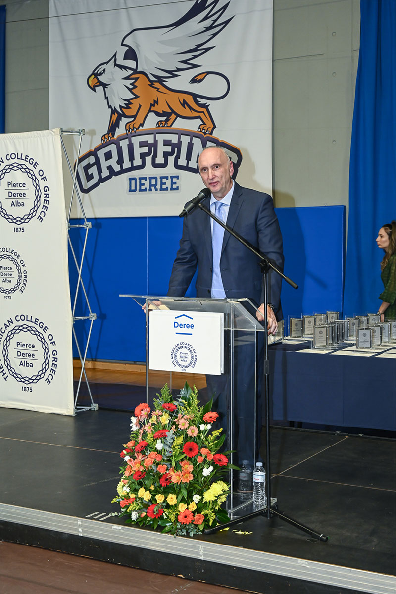 Athletes from all sports of the Deree Sports Academy – swimming, tennis, volleyball, basketball, soccer, and track & field – were honored for their accomplishments and participation during the previous year. A special tribute was given to multiple Olympic gold medalist, Pyrros Dimas, for his tremendous contribution and dedication to Sports. He gave a short speech offering valuable advice to our young athletes.