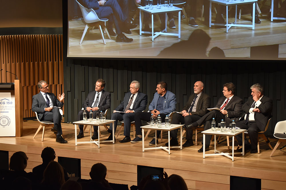 The panel consisted of Eftychios Vasilakis (Aegean), Markos Veremis (Upstream), Kelly Katsou (Pharmathen Pharmaceuticals), Nikolaos Bakatselos (American Chamber), and Pavlos Mylonas (National Bank of Greece). The discussion was moderated by Niki Lyberaki.