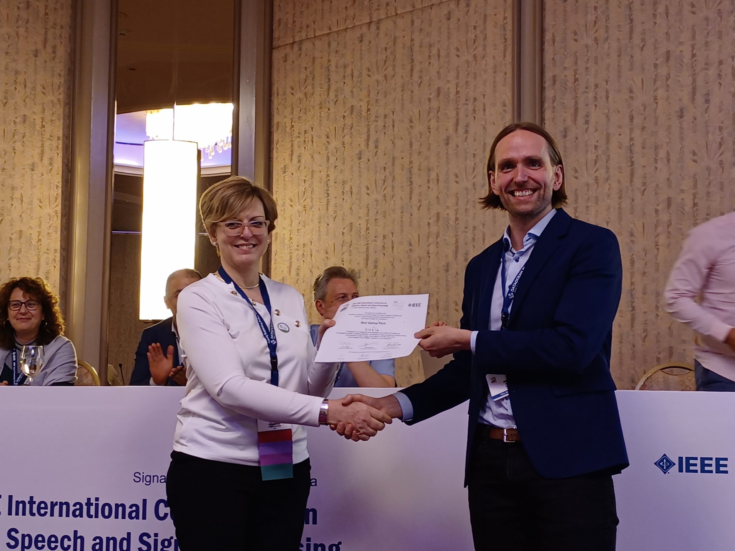 The forum concluded with each company’s pitch to the judges and audience and the awarding of the startup competition winners. This year’s first prize went to Treble (Cloud-based sound systems), the second prize was handed to Waveye (AI-driven imaging radars) and in third place came Voinosis (Diagnosis of diseases such as dementia based on voice analysis). The prizes were awarded to the winners by IEEE SPS President Professor Athina Petropoulou.