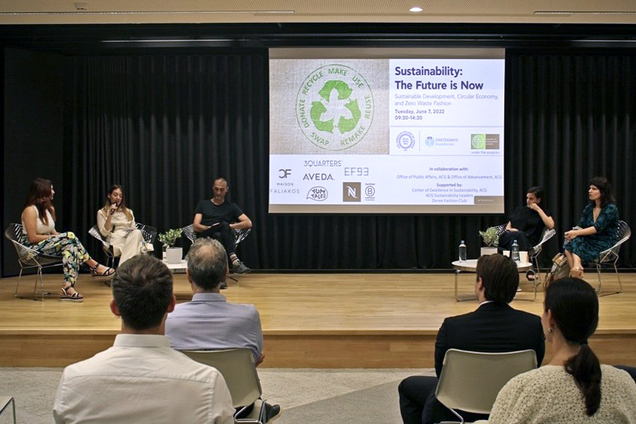 ACG Senior Sustainability Manager Ms. Rania Assariotaki mentioned that “We were happy and honored to welcome on campus and engage in panel discussions with esteemed and inspiring professionals, business partners, and friends from businesses, NGOs, and academia on the topics of sustainability and circular economy. It was very impactful to witness how Greek SMEs operating in the fashion industry have been promoting sustainable best practices. As a responsible academic institution educating the “leaders of tomorrow”, The American College of Greece has joined forces with Chatzigakis Foundation, a public-benefit foundation that shares the same philosophy in further enhancing the public dialogue and awareness on a topic of both local and global concern”, in her opening remarks.