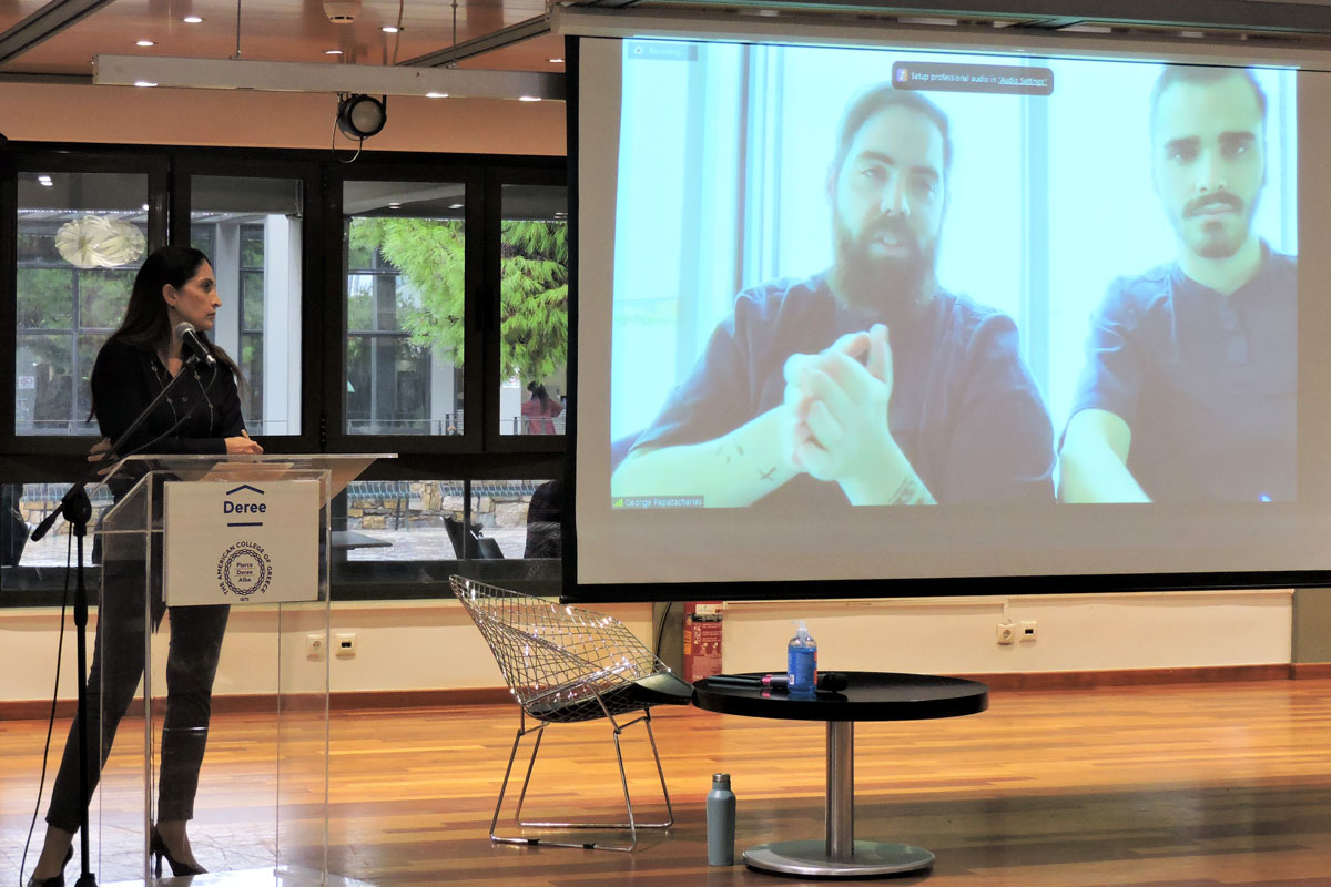 Parallel to the discussion, two booths were placed outside the Deree Student Lounge with informative material and videos created by the ACG Sustainability Leaders, the ES Society and ACG SDG Student Hub.