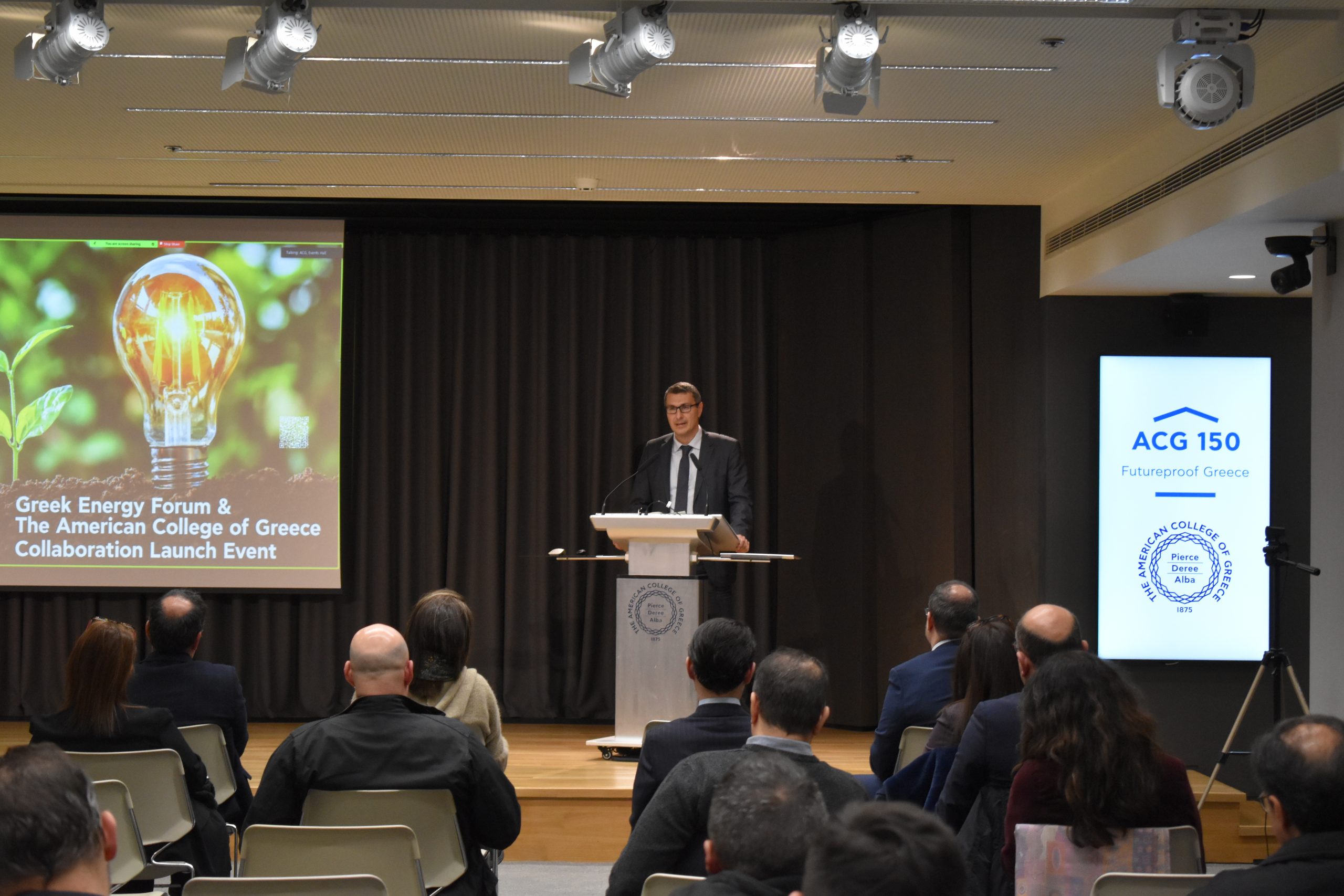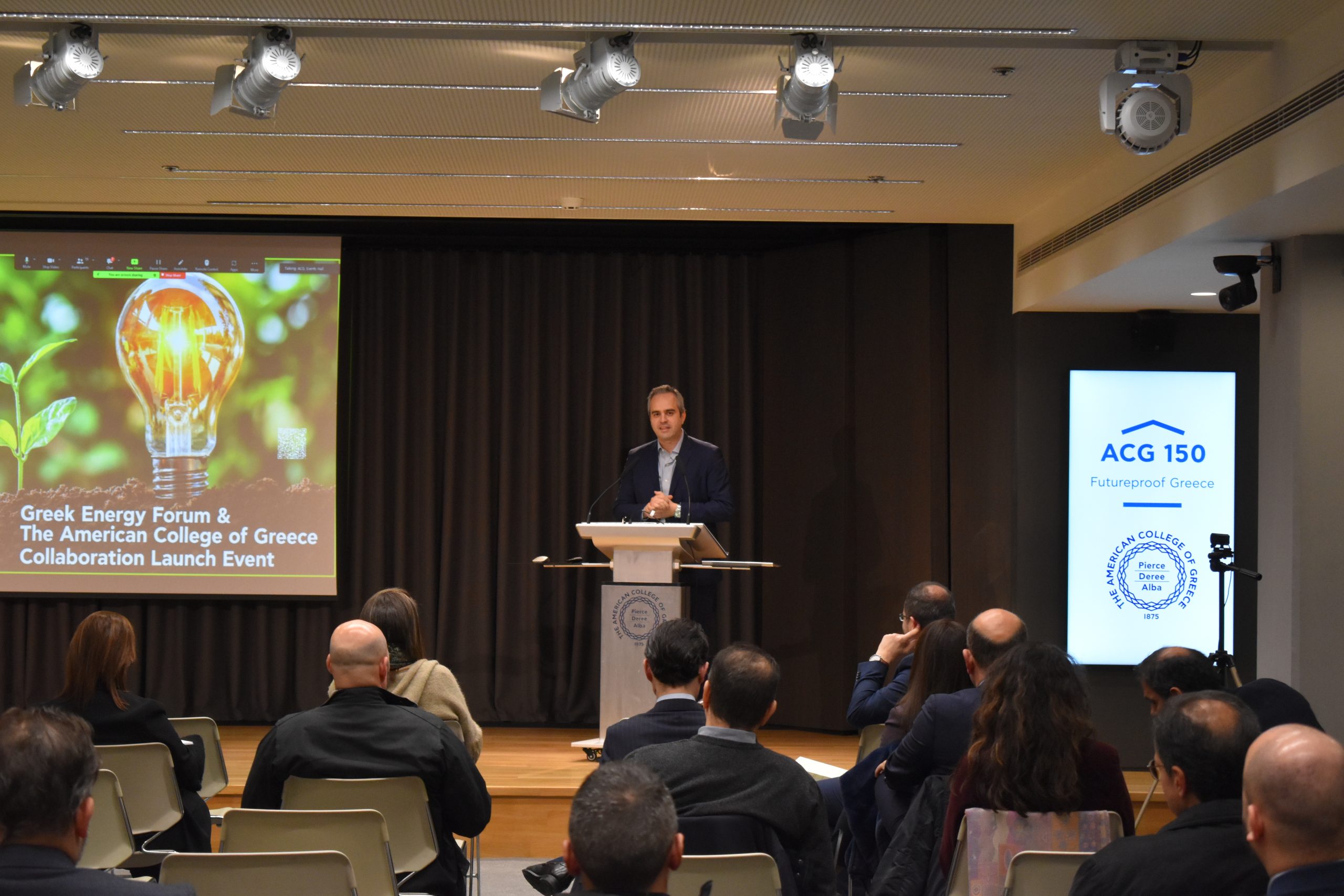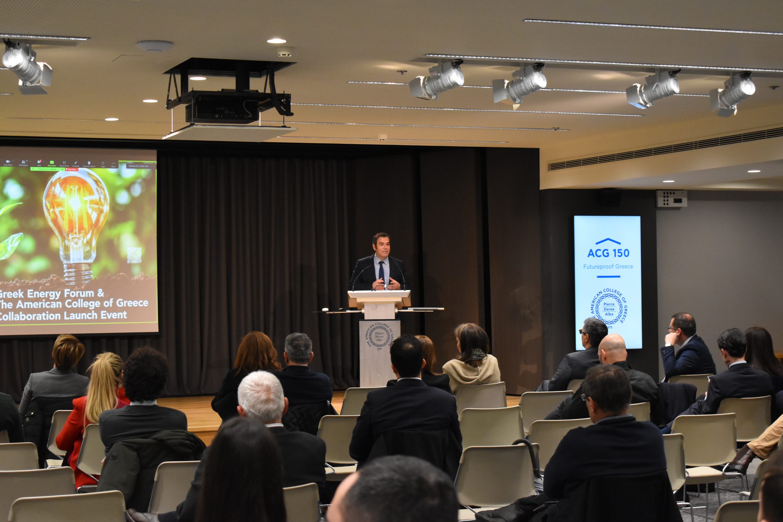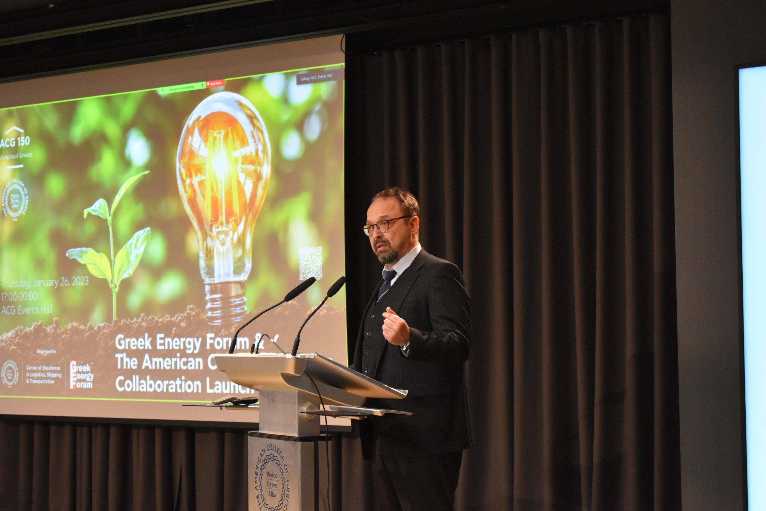 Dr. Panos Vlachopoulos, ACG Vice President of Academic Affairs, gave welcoming remarks and discussed how the ACG 150 plan is leveraging educational programs for economic, social, and cultural impact as well as consolidating, supporting, and expanding ACG’s activities in performing research, creating technology and fostering innovation. Alexandros Lagakos, Co-Founder of the Greek Energy Forum and COO of Blue Grid, discussed the GEF’s goals and introduced us to the Energy Academy: “The Academy aspires to highlight energy policy challenges and raise commercial awareness amongst university students and collaborate with academic institutions, such as The American College of Greece.”