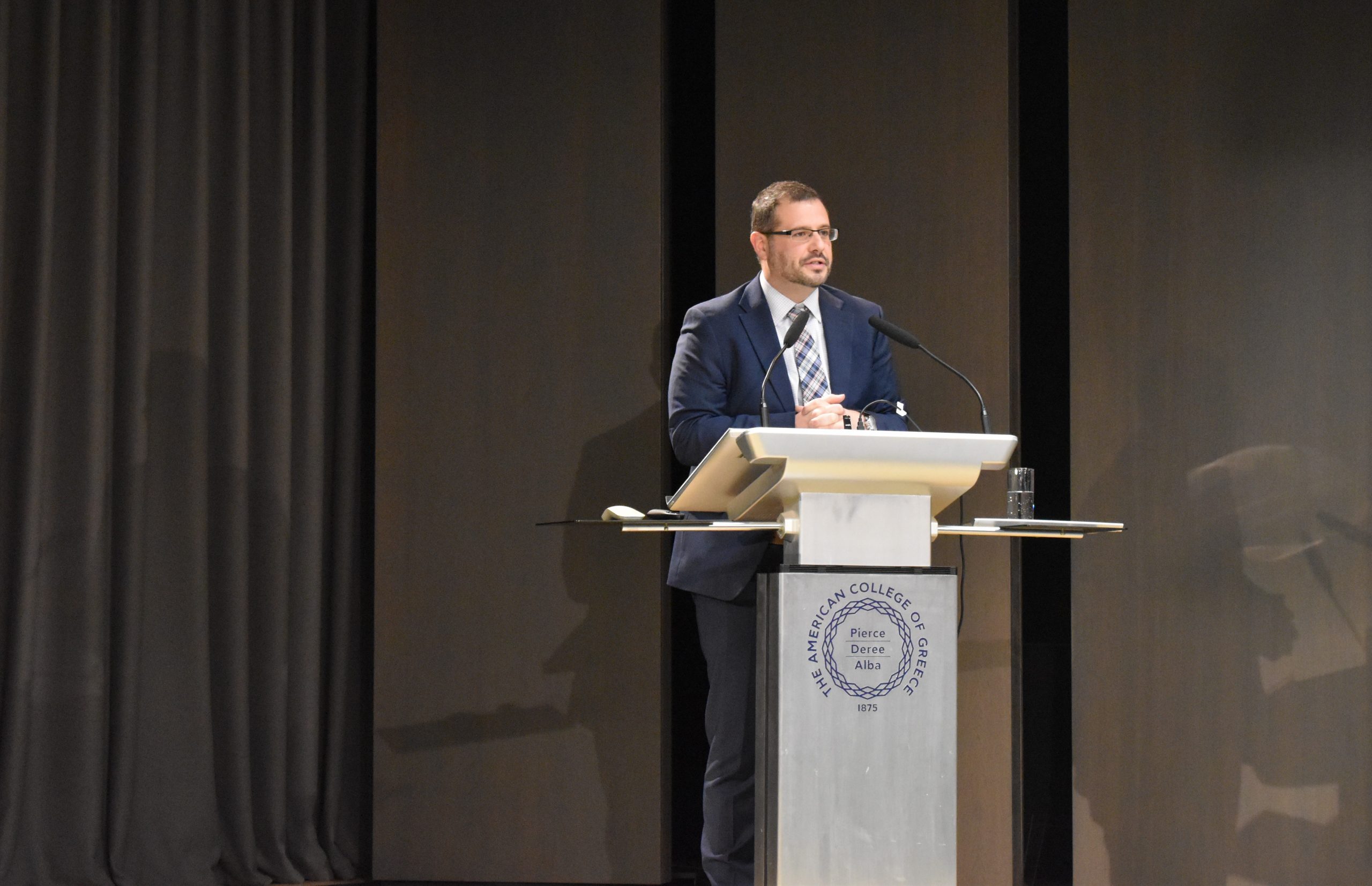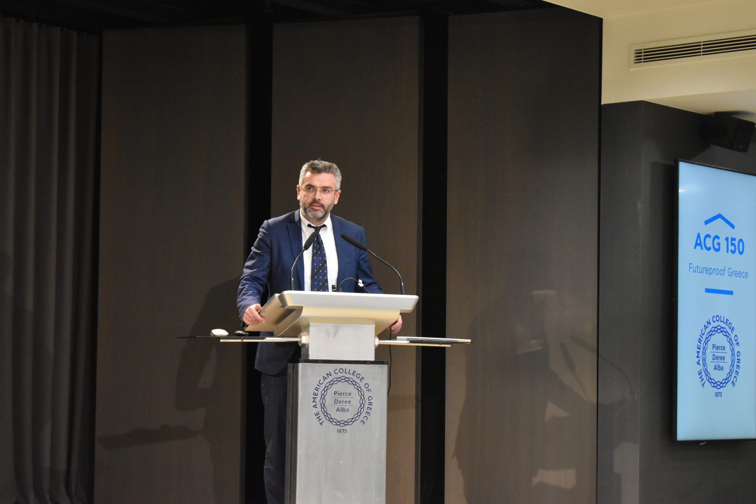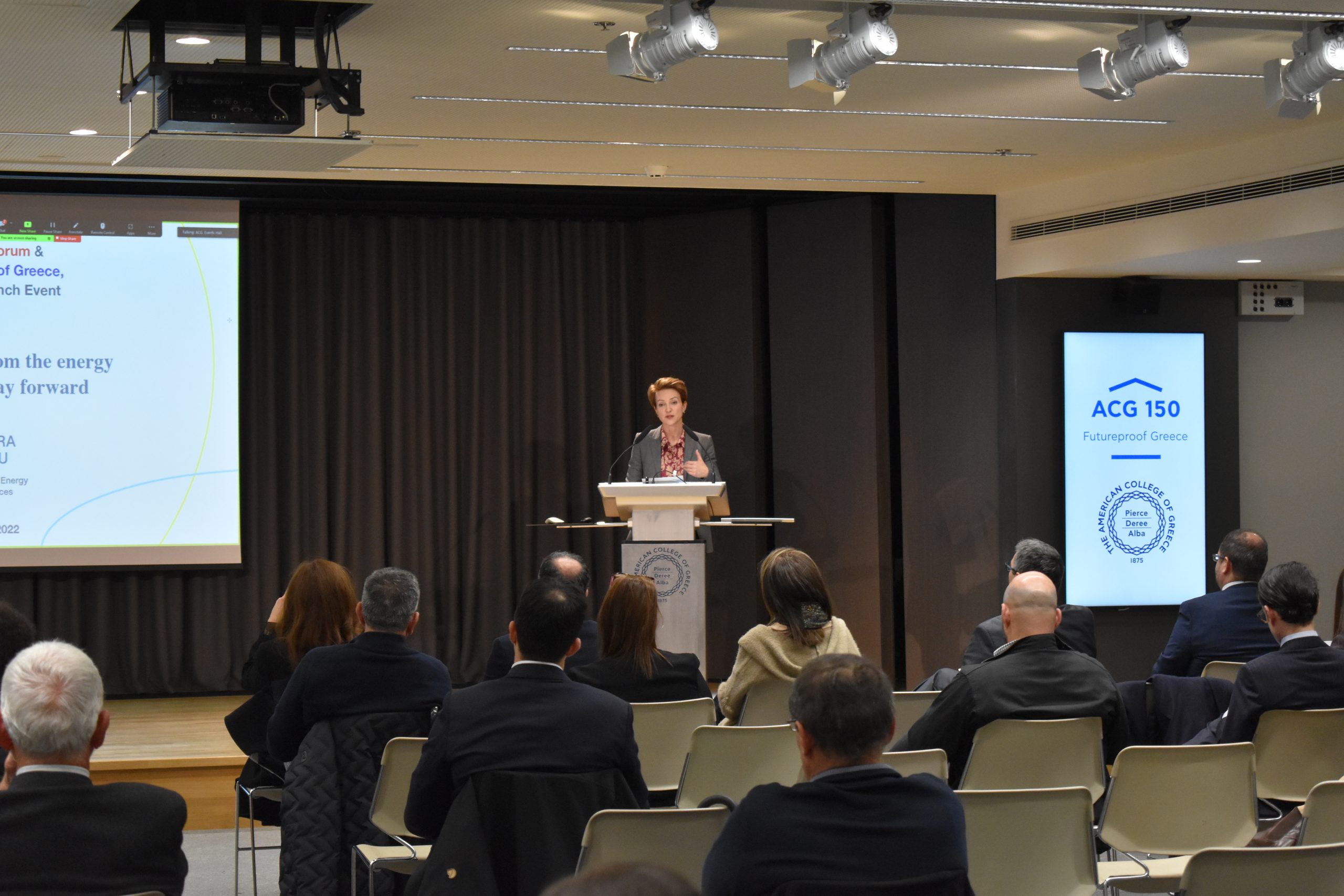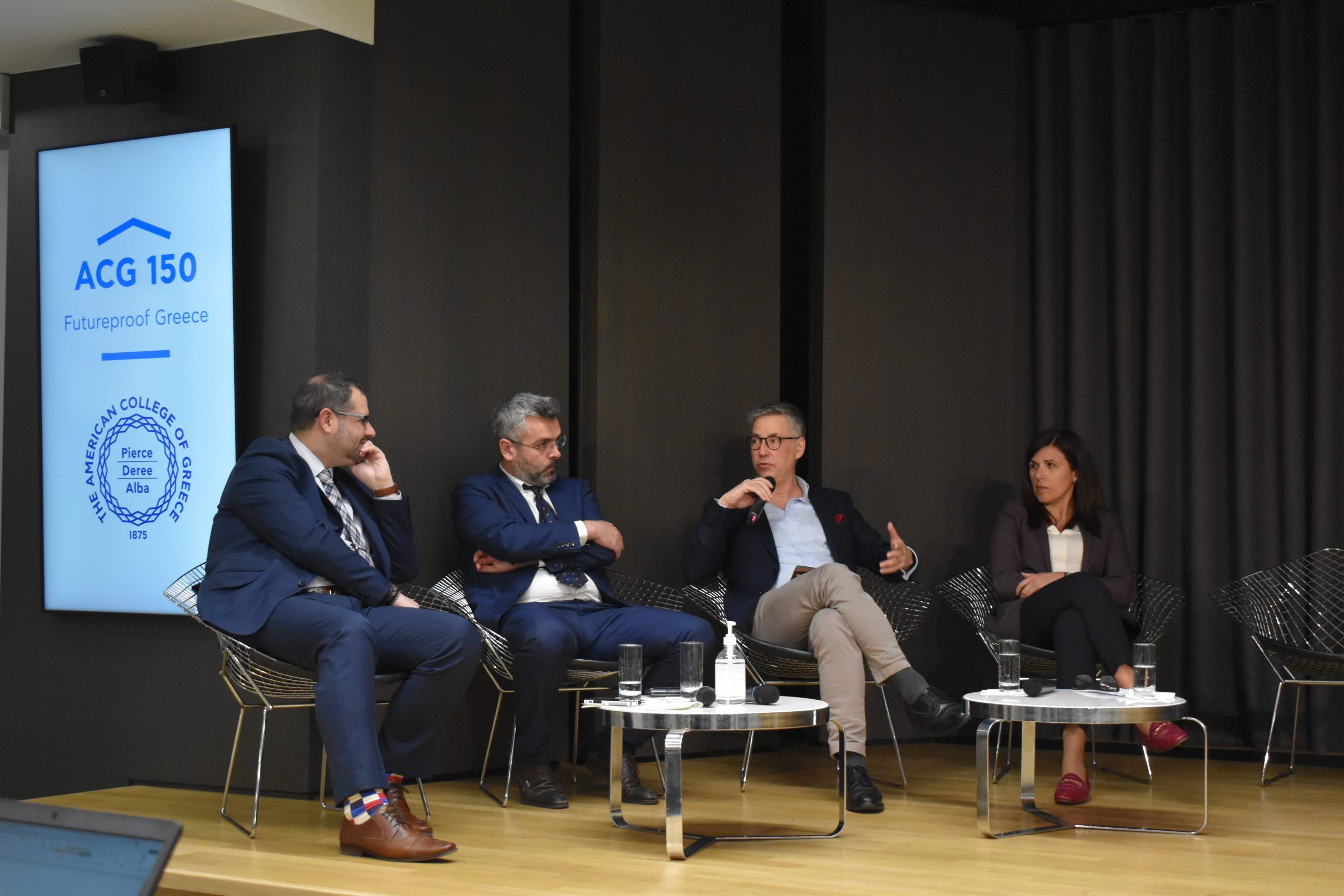 Dr. Panos Vlachopoulos, ACG Vice President of Academic Affairs, gave welcoming remarks and discussed how the ACG 150 plan is leveraging educational programs for economic, social, and cultural impact as well as consolidating, supporting, and expanding ACG’s activities in performing research, creating technology and fostering innovation. Alexandros Lagakos, Co-Founder of the Greek Energy Forum and COO of Blue Grid, discussed the GEF’s goals and introduced us to the Energy Academy: “The Academy aspires to highlight energy policy challenges and raise commercial awareness amongst university students and collaborate with academic institutions, such as The American College of Greece.”