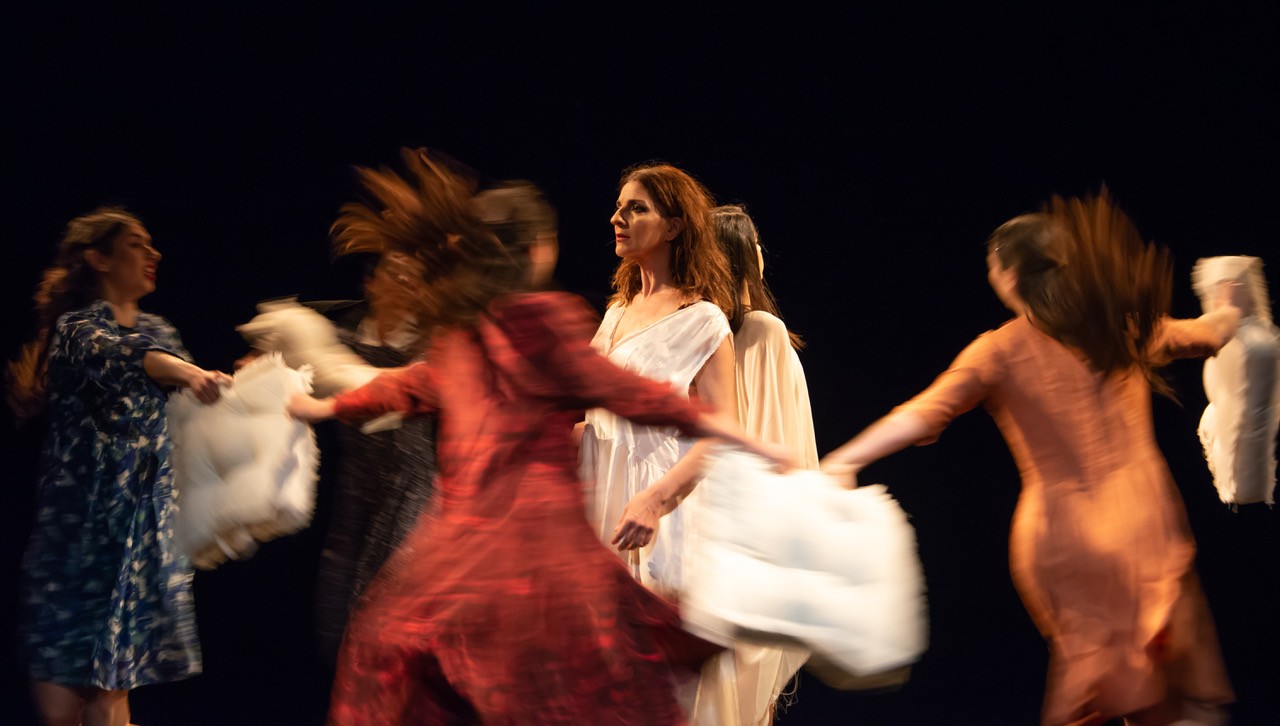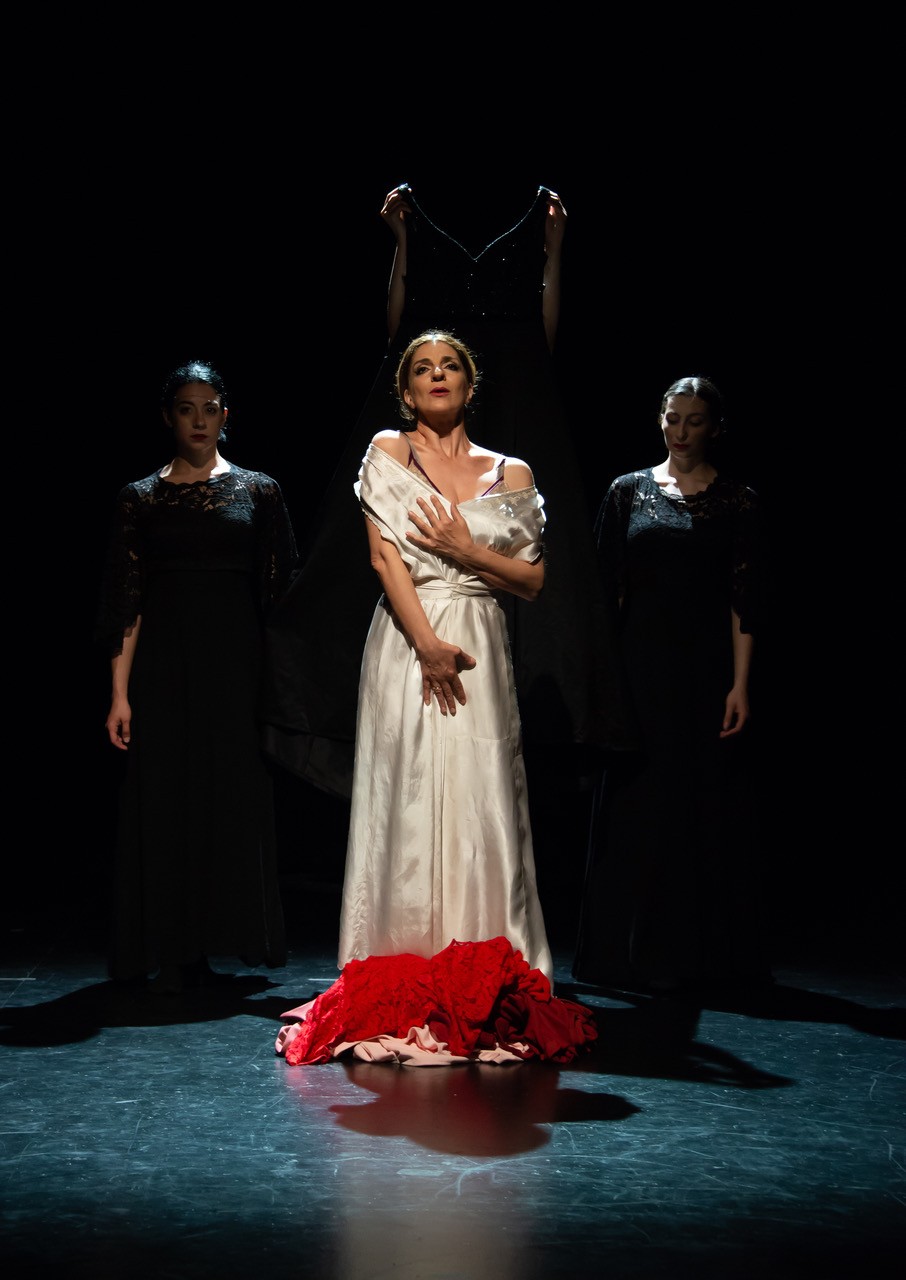 Actress Evelina Arapidis led the performance with a powerful performance, shifting effortlessly between vulnerability and strength as she guided the audience through the story’s emotional shifts. Choreographer Ilias Bageorgos’s evocative movement, brought to life by five dancers, deepened the emotional landscape of the piece. Francesco Infante’s costume design added striking theatricality, especially a dramatic, voluminous skirt worn by the actress mid-performance, transforming the stage into a living portrait of Calla’s grandeur. George Vlachonikolos’s beautiful lighting design heightened the production’s visual impact, giving the stage a dreamlike pulse.