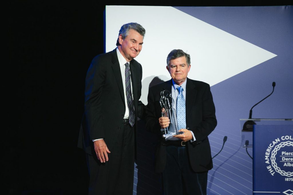 The Arts & Culture award was presented to Sophia Kalogeropoulou (Pierce ’64), while the Business Awards were bestowed upon Elena Chouliara (Alba ’01), Nelly Katsou (Pierce ’83), Vassilios Katsos (Pierce ’91), and Nikos Koumettis (Deree ’86). Barbara Geladakis, MD (Pierce ’95) received the Education & Science award, and the Social Impact award was granted to Vana Lavidas (Pierce ’79) and Lena Papalexopoulou (Pierce ’82). The pinnacle of recognition was reserved for Athina Martinou (Pierce’45), and her son, Thanasis Martinos, graciously accepted the prestigious Maria West Lifetime Achievement award on behalf of his mother. The award statues were created by sculptor Athena Politopoulou-Kargsten, Pierce ’56 & ’57.