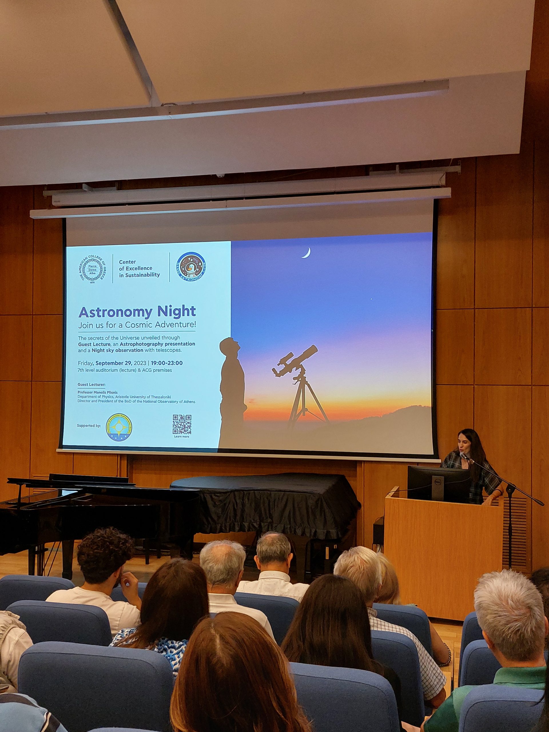 In a packed auditorium, Professor Manolis Plionis, Department of Physics, Aristotle University of Thessaloniki, Director and President of the BoD of the National Observatory of Athens and member of the External Advisory Board of the Center of Excellence in Sustainability-ACG, gave an inspiring lecture on “Modern Cosmology in the era of the James Webb Space Telescope,” which was received enthusiastically by the audience.