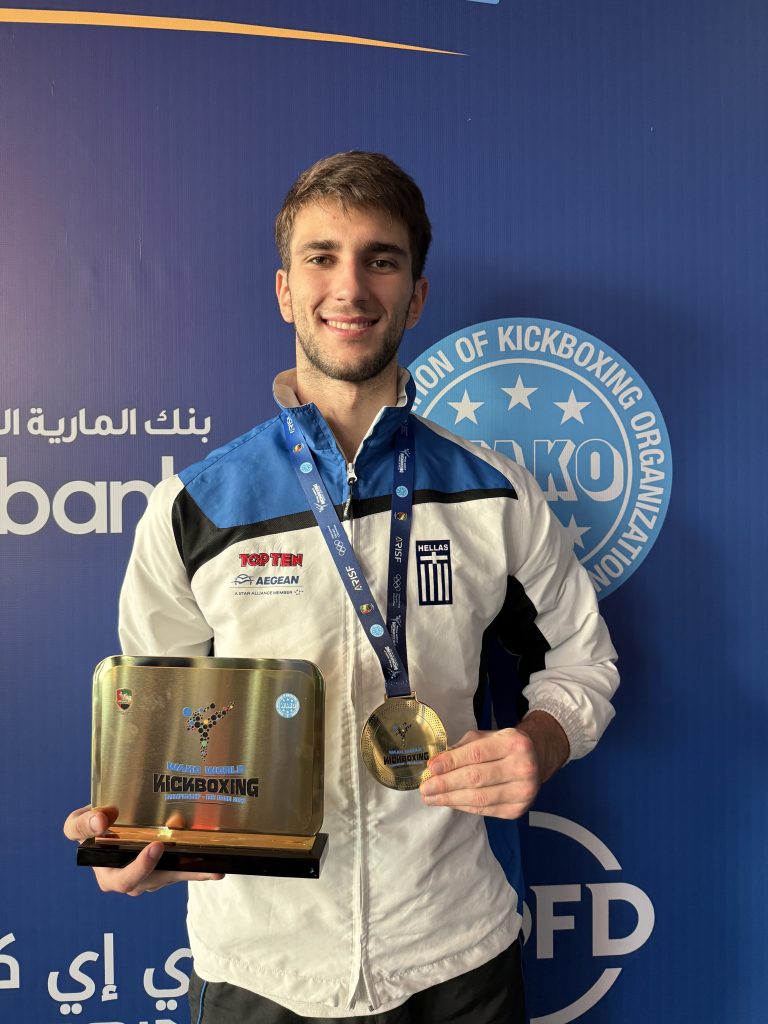 Deree – The American College of Greece proudly celebrates an outstanding international achievement by Deree student-athlete Dimitrios Economo, who captured 1st place and the gold medal at the 2025 WAKO World Kickboxing Championships in Abu Dhabi, United Arab Emirates, earning the title of World Champion in his category.
