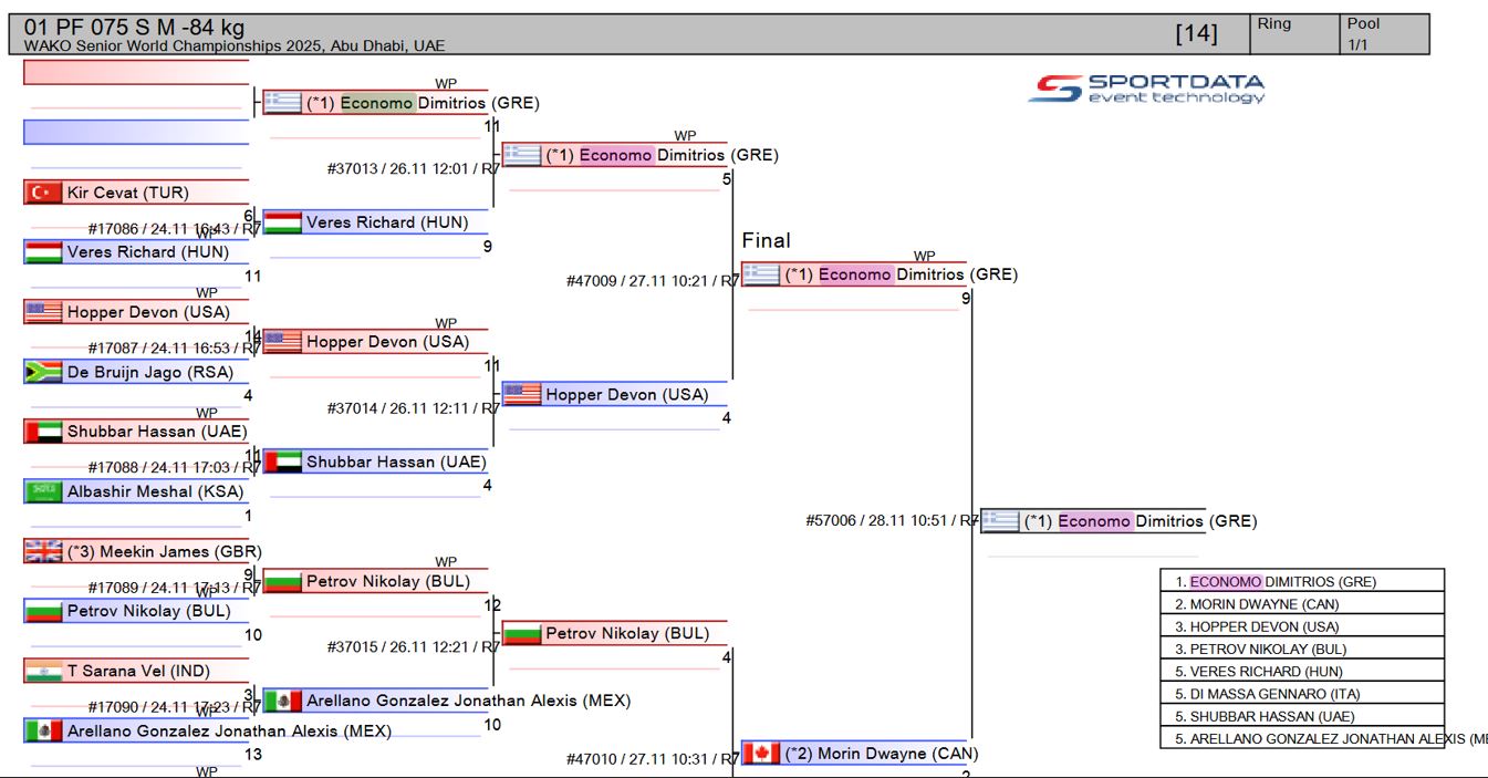 Competing in Senior Men’s 84 kg – (01 PF 075 S M-84 KG), Dimitrios advanced through a highly competitive bracket featuring world-class opponents and secured the top spot on the podium.