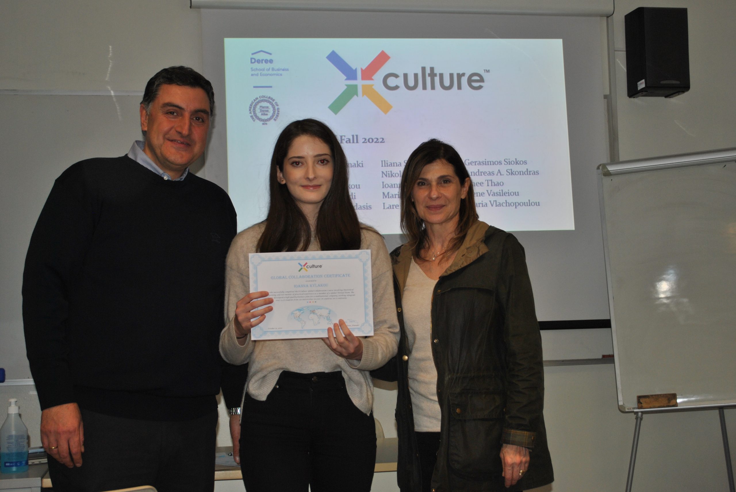 The Cross-Cultural Management course aims at helping students develop or enhance students global business skills and their cross-cultural competence, i.e., their ability to interact with individuals from different cultures effectively. Participation in the X-Culture project is a required assessment component of the course. The class of Fall 2022 did exceptionally well in the X-Culture competition. 10 out of the 15 students attending the class received an invitation from X-Culture to participate in their Coaching Program. Such invitations were extended to students who successfully completed the X-Culture Project, had high peer evaluations, scored high on the cultural and emotional intelligence tests, showed leadership and creativity, and met all deadlines. During the final class of the course, students received official certificates of participation in X-Culture, which Dean Annie Triantafillou awarded to the students.