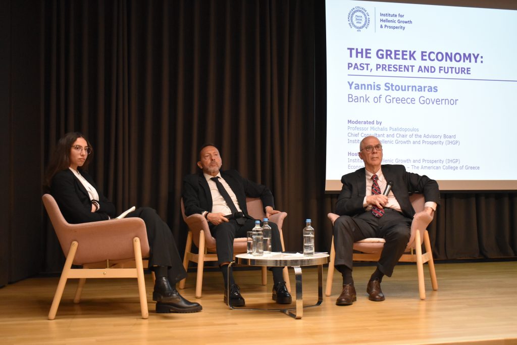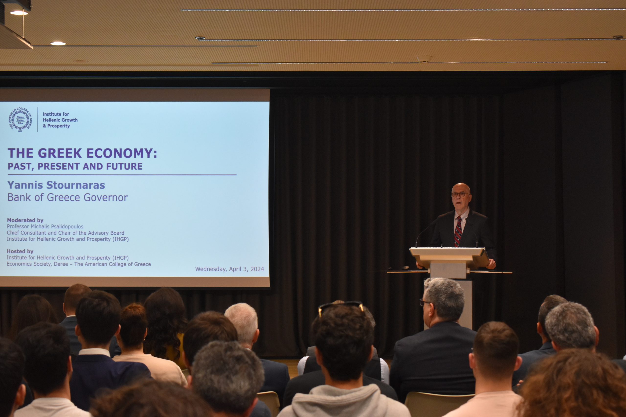 The American College of Greece recently hosted an insightful discussion featuring Yannis Stournaras, the Governor of the Bank of Greece, who captivated an audience with a thorough examination of the Greek economy’s evolution, current state, and its promising future. Organized by the Institute for Hellenic Growth and Prosperity (IHGP) along with the Economics Society of Deree – ACG, this event took place on April 3, 2024, attracting students, faculty, and economics enthusiasts alike.