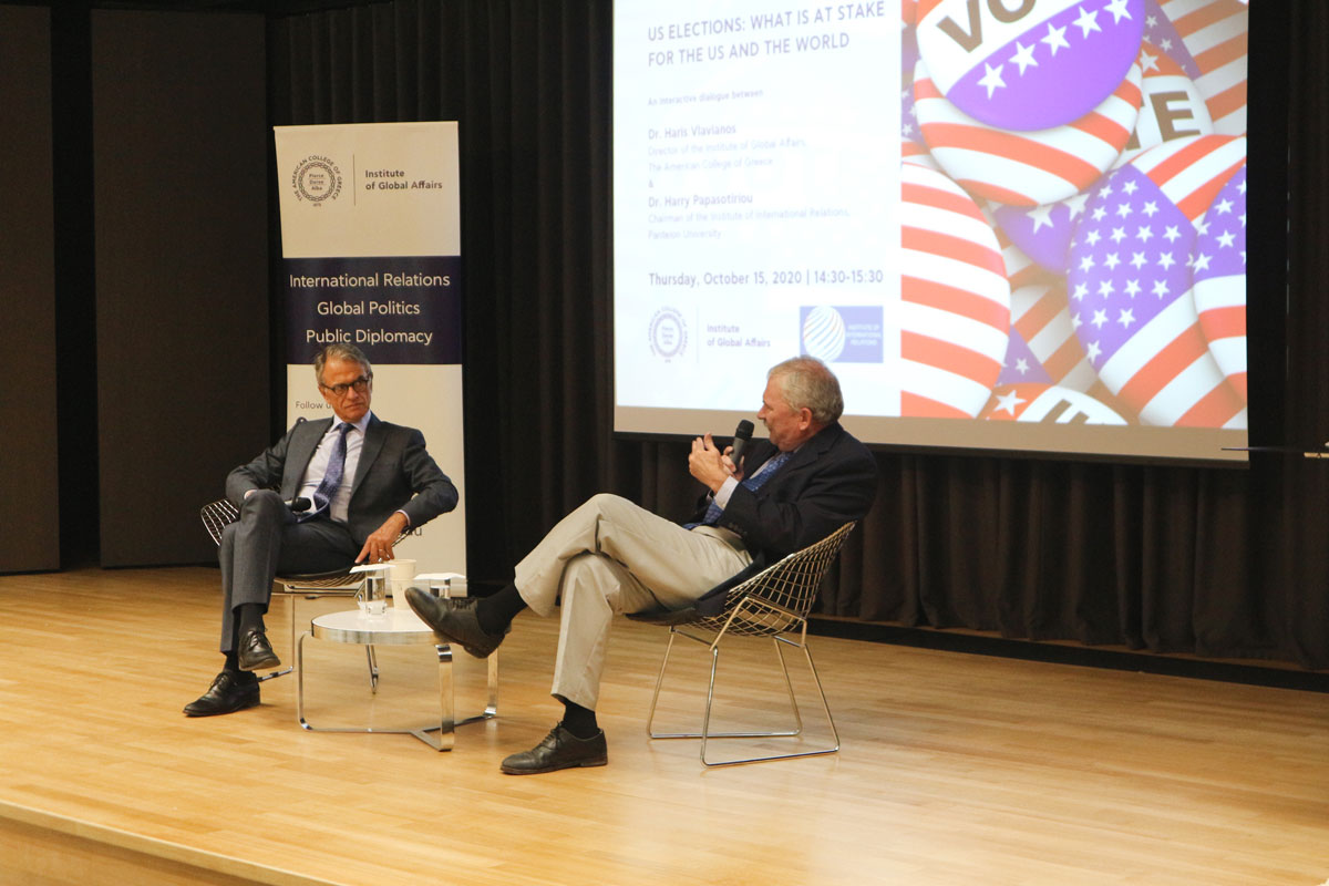 An interactive dialogue about the upcoming United States presidential elections was organized by the Institute of Global Affairs, The American College of Greece and the Institute of International Relations, Panteion University, with speakers Dr. Haris Vlavianos, Director of the Institute of Global Affairs, and Dr. Harry Papasotiriou, Chairman of the Board of Directors of the Institute of International Relations.