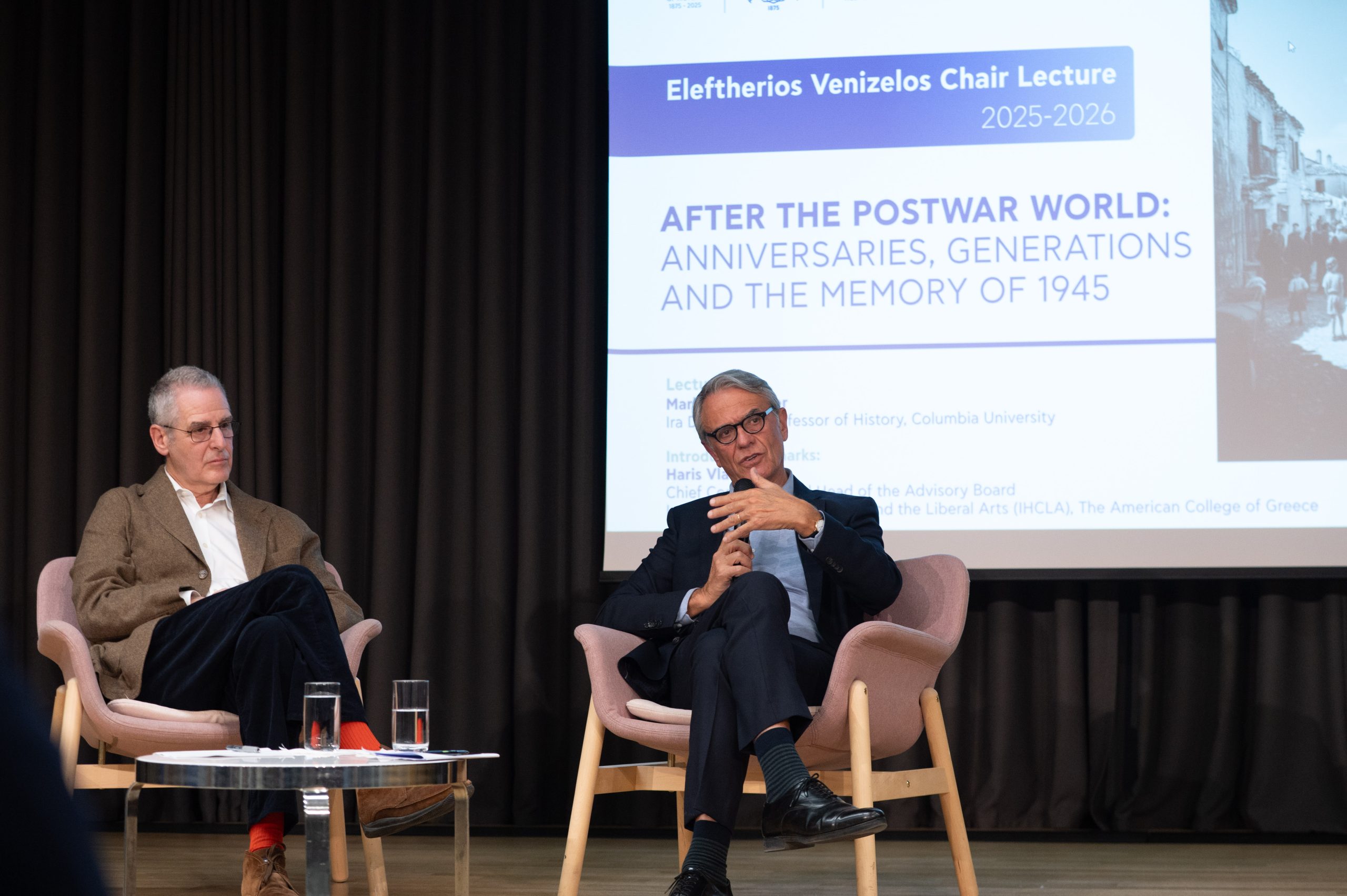 On Thursday, November 13, 2025, The American College of Greece welcomed distinguished historian Mark A. Mazower, Ira D. Wallach Professor of History at Columbia University, as the keynote speaker for the latest installment of the Eleftherios Venizelos Chair Lecturer Series. His lecture titled “After the Postwar World: Anniversaries, Generations and the Memory of 1945,” took place at the ACG Events Hall and was organized by the Institute for Hellenic Culture and the Liberal Arts (IHCLA).