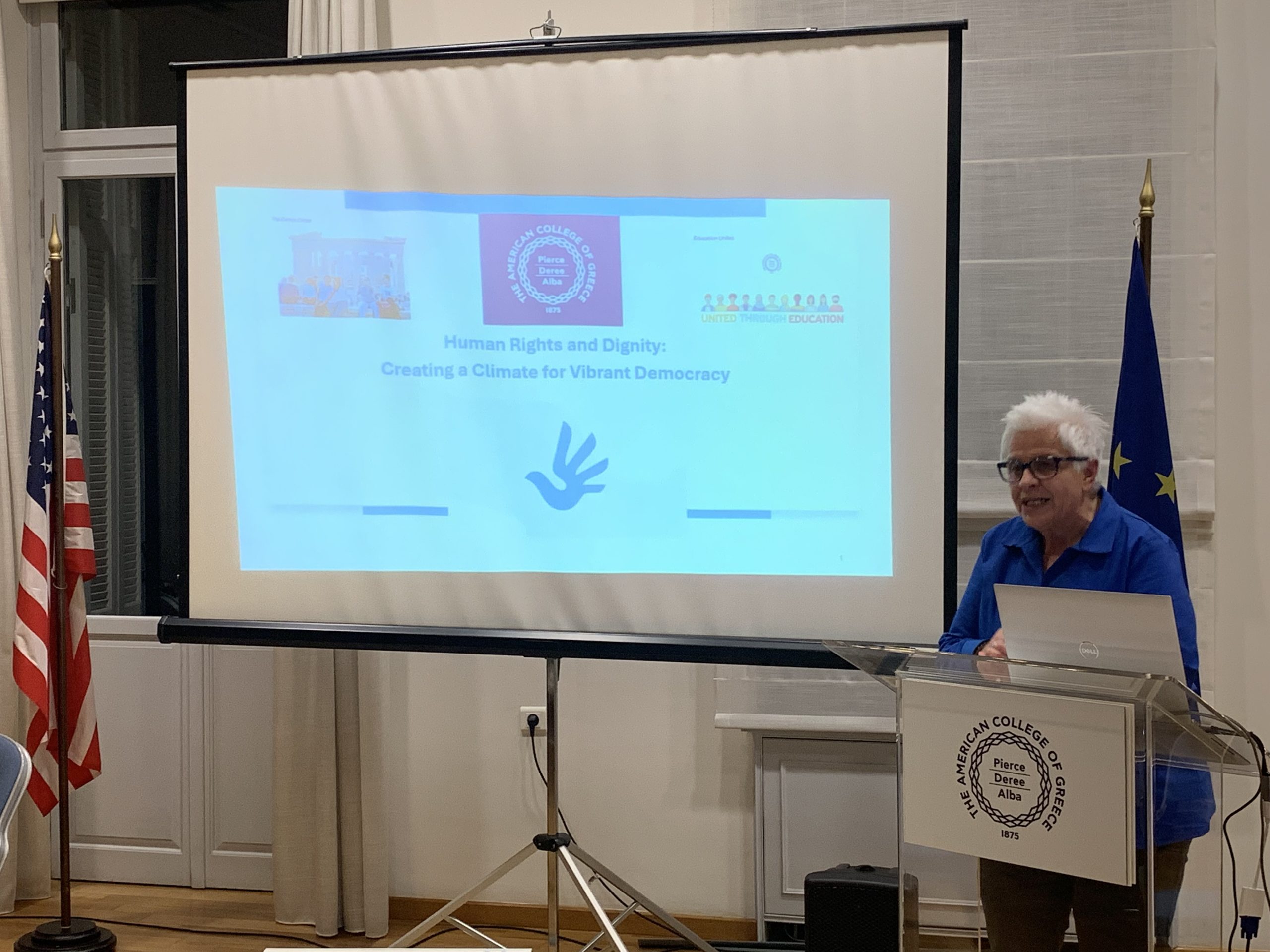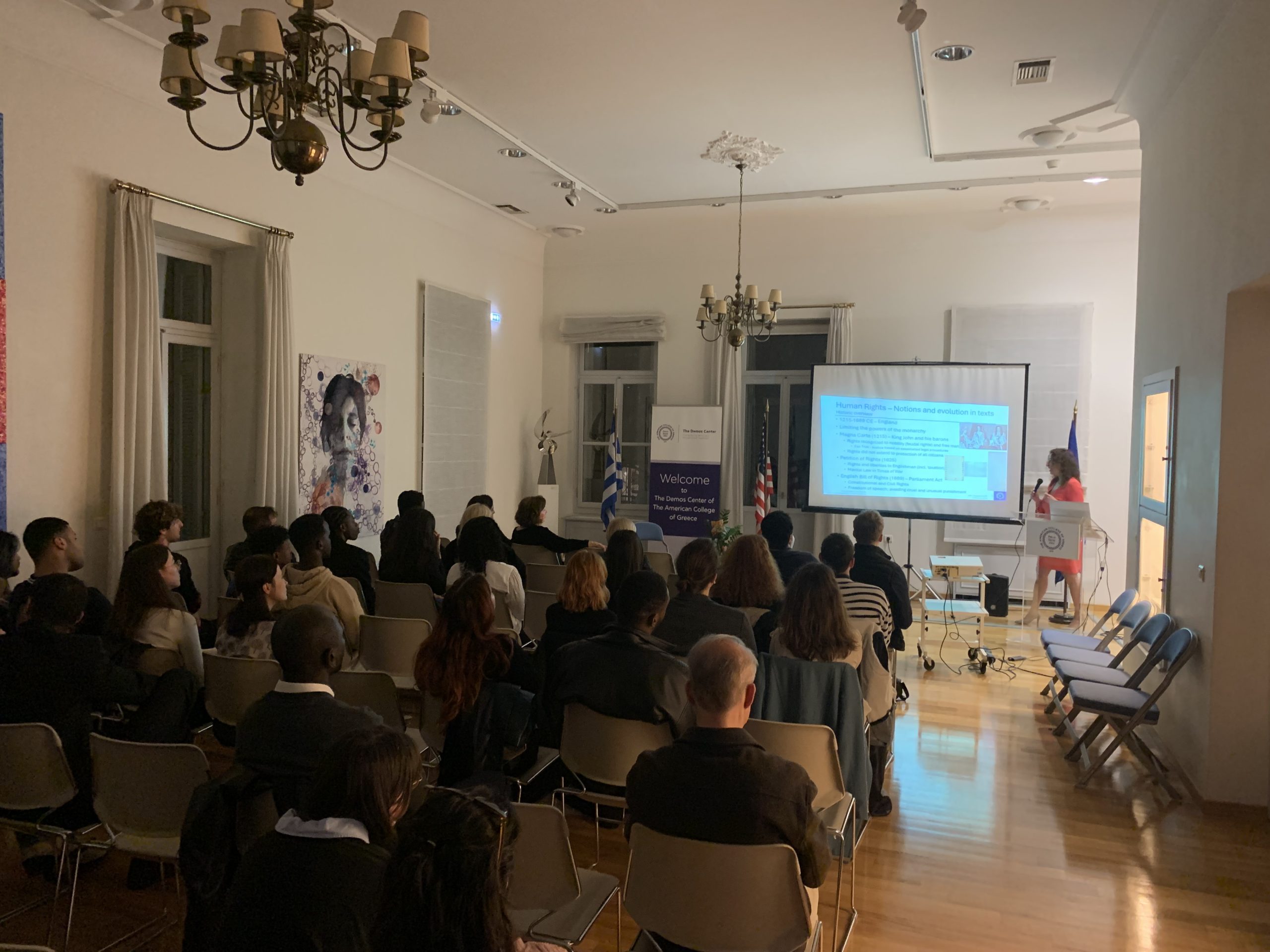 ACG’s philosophy of “to serve and not to be served” embodies the values of humanity and inclusivity. In celebration of the 75th anniversary of the Universal Declaration of Human Rights, The Demos Center at Deree – The American College of Greece, part of the ACG Institute for Hellenic Culture and the Liberal Arts, has organized a series of 5 events for the first annual Focus: Human Rights program. The first of these events, entitled “Human Rights and Dignity: Creating a Climate for Vibrant Democracy,” took place on Thursday, February 22, 2024, at The Demos Center in Plaka, Athens.