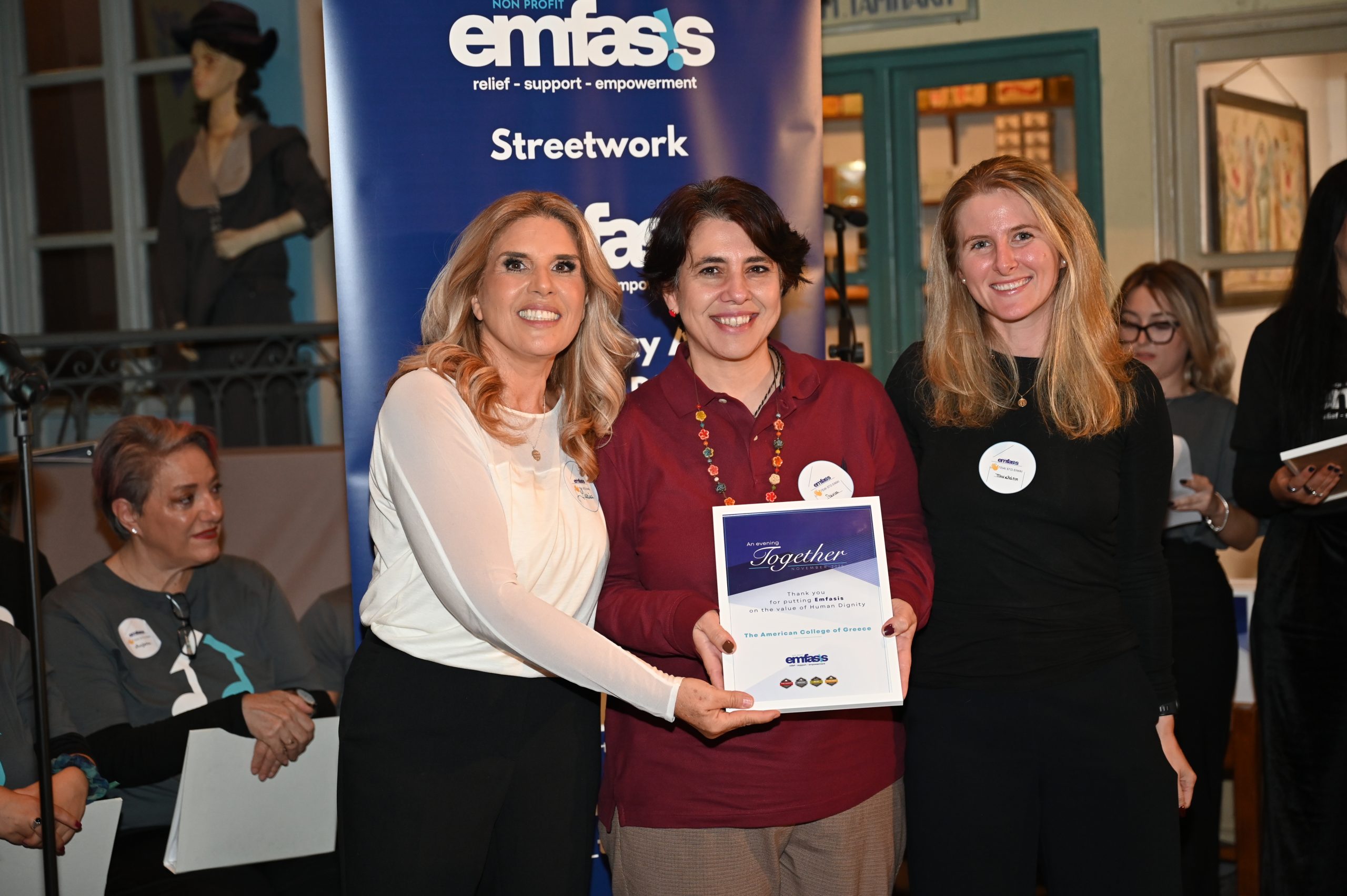 On November 13, 2025, representatives from The American College of Greece had the pleasure of attending “An Evening Together”, the anniversary event organized by the non-profit organization EMFASIS to celebrate its 13 years of dedicated work in supporting individuals experiencing homelessness and social exclusion as well as serving as a gesture of appreciation to all those who have supported EMFASIS’ vital contribution to society.