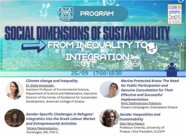 During the European Sustainable Development Week 2025, Dr. Stella Apostolaki, Assistant Professor of Environmental Science at the Department of Science and Mathematics – Deree, and Executive Director of the Center of Excellence in Sustainability, The American College of Greece (ACG), delivered 2 engaging discussions under the main theme of “Dimensions of Sustainability in Higher Education: Theory, Research, and Practice.”