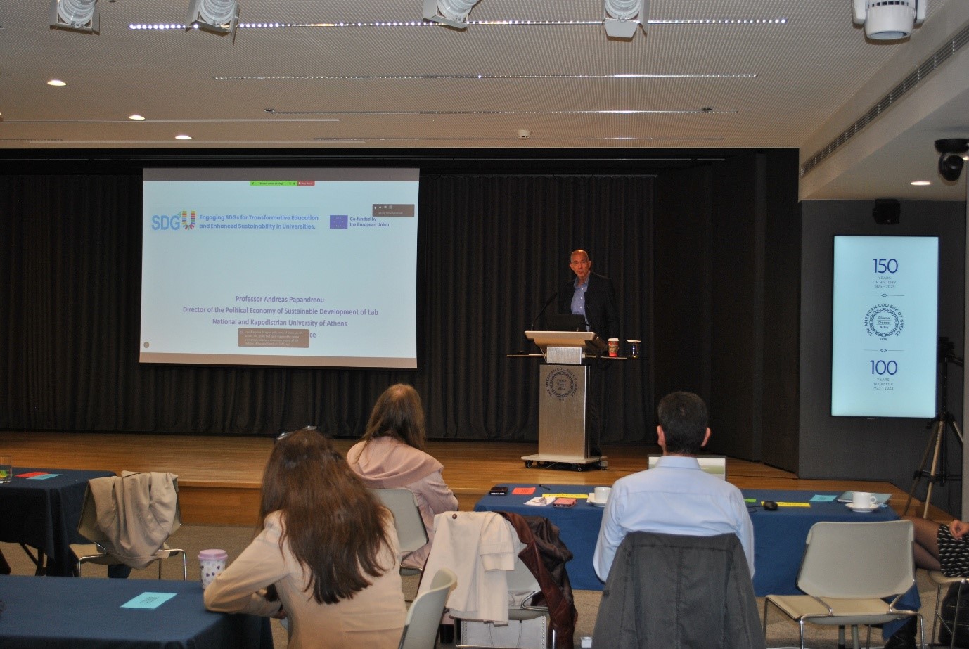 a. The Faculty Session started with a presentation on the 17 UNSDGs by Dr. Stella Apostolaki, Assistant Professor of Environmental Science, Deree – ACG; Executive Director, Center of Excellence in Sustainability (CoES) and PI of the Erasmus+ project for ACG, and Dr. Paraskevi Papadopoulou, Professor Biophysicist, Cell Biologist, Deree – ACG; Executive Director, co-PI of the Erasmus+ project for ACG. It was followed by a presentation on the SDG4U project and the respective mapping tool, delivered by the project coordinator, Professor Andreas Papandreou, Director of the Political Economy of Sustainable Development at Lab, National and Kapodistrian University of Athens, and Co-Chair of UN SDSN Greece.